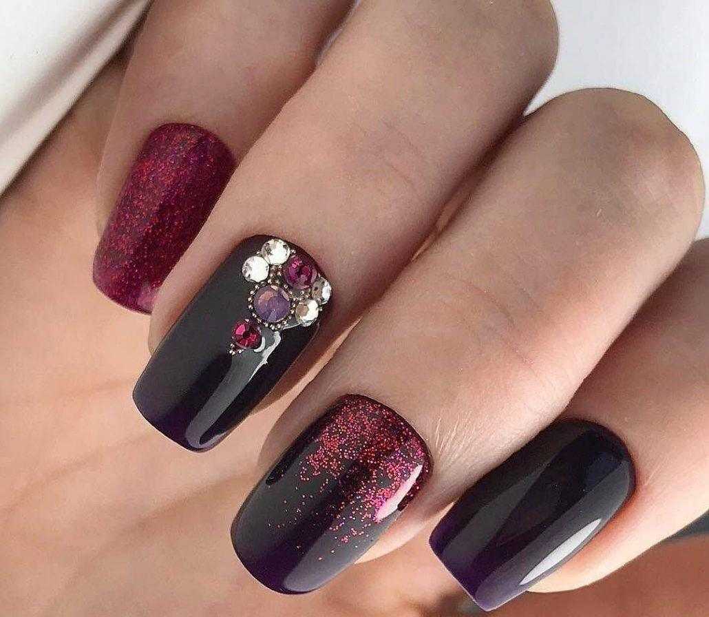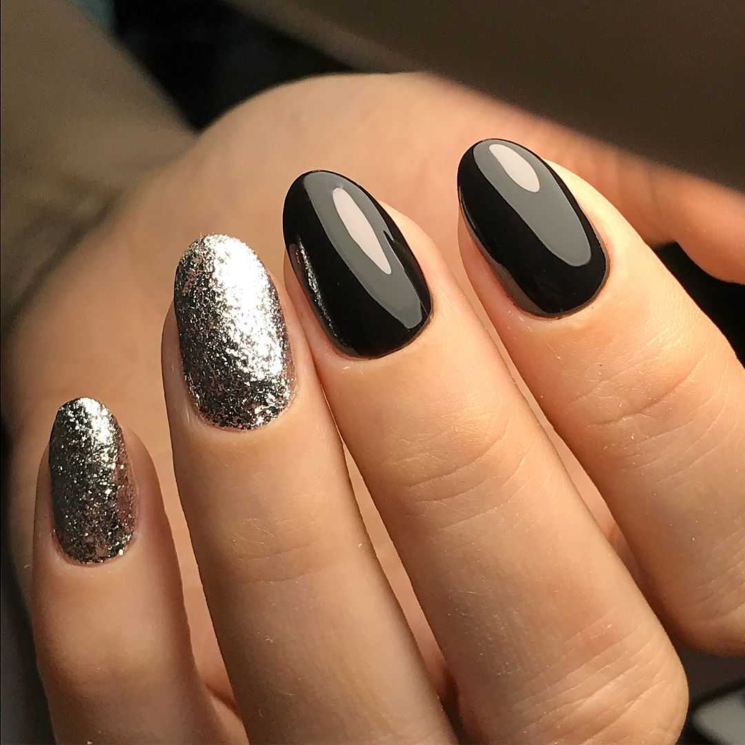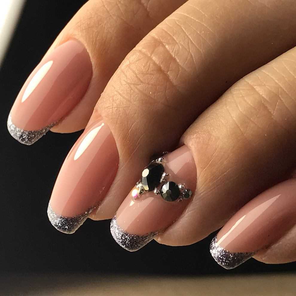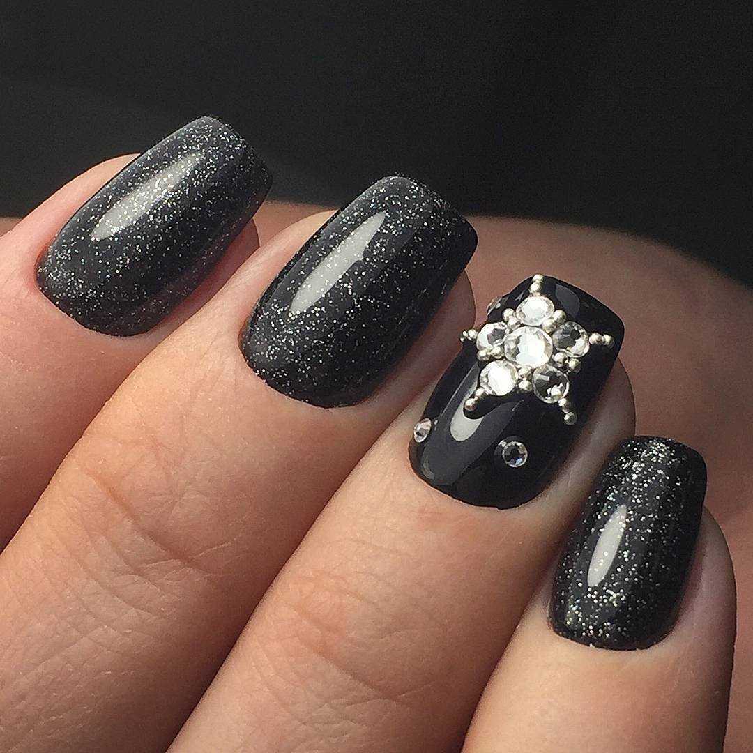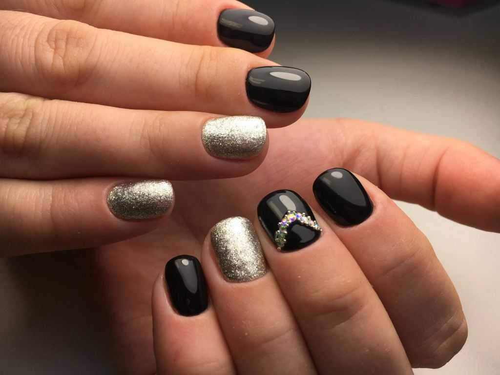 В дизайне можно применять различные блестки, стразы, крупные камни, блестящую фольгу разных цветов. Такой вариант хорош для торжественных случаев, вечернего и новогоднего вариантов. Ногти покрываются основой, затем на специальный клей пинцетом наносятся темные стразы, тогда маникюр будет более универсальным, или блестящие камни — для роскошного праздничного вида. Стразы лучше наносить на один или несколько ногтей каждой руки, чтобы избежать излишней вычурности.
