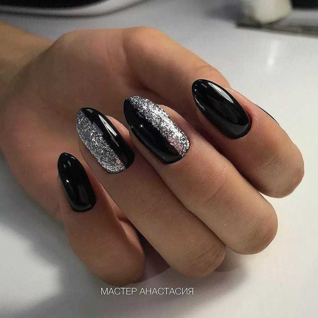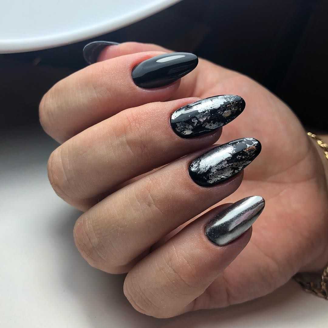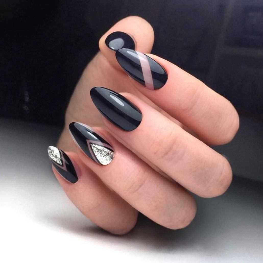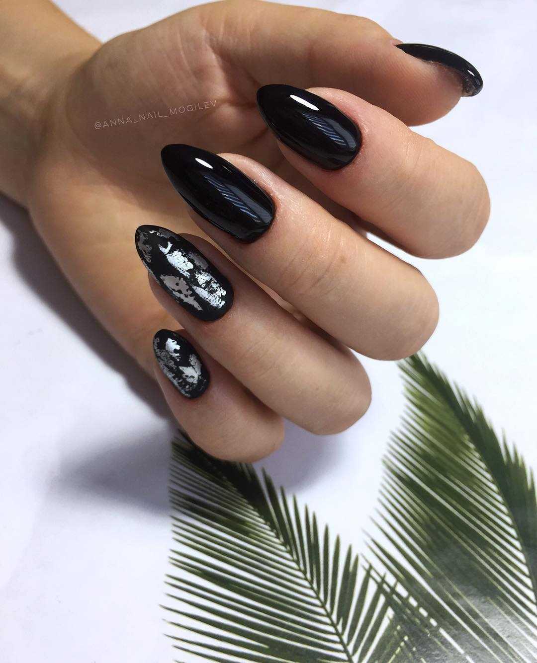 Темный маникюр на миндаль с глубоким оттенком гель-лака смотрятся благородно и утончённо. На длинные черные можно себе позволить любой дизайн, но злоупотреблять им не рекомендуется. Оформить 2-3 пальчика — будет в самый раз.