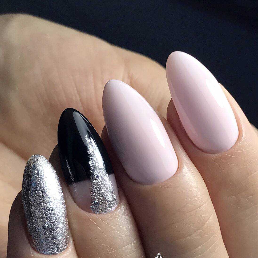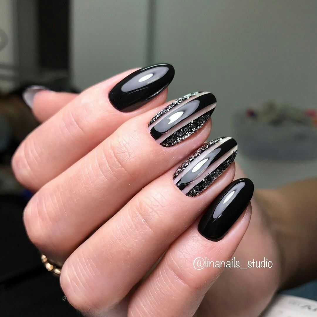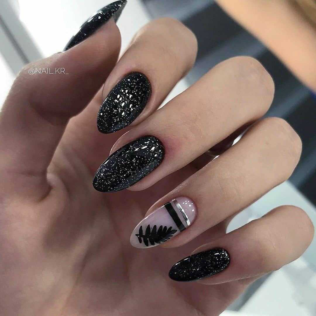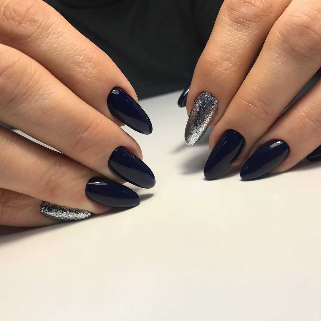 Темный маникюр на миндаль с глубоким оттенком гель-лака смотрятся благородно и утончённо. На длинные черные можно себе позволить любой дизайн, но злоупотреблять им не рекомендуется. Оформить 2-3 пальчика — будет в самый раз.