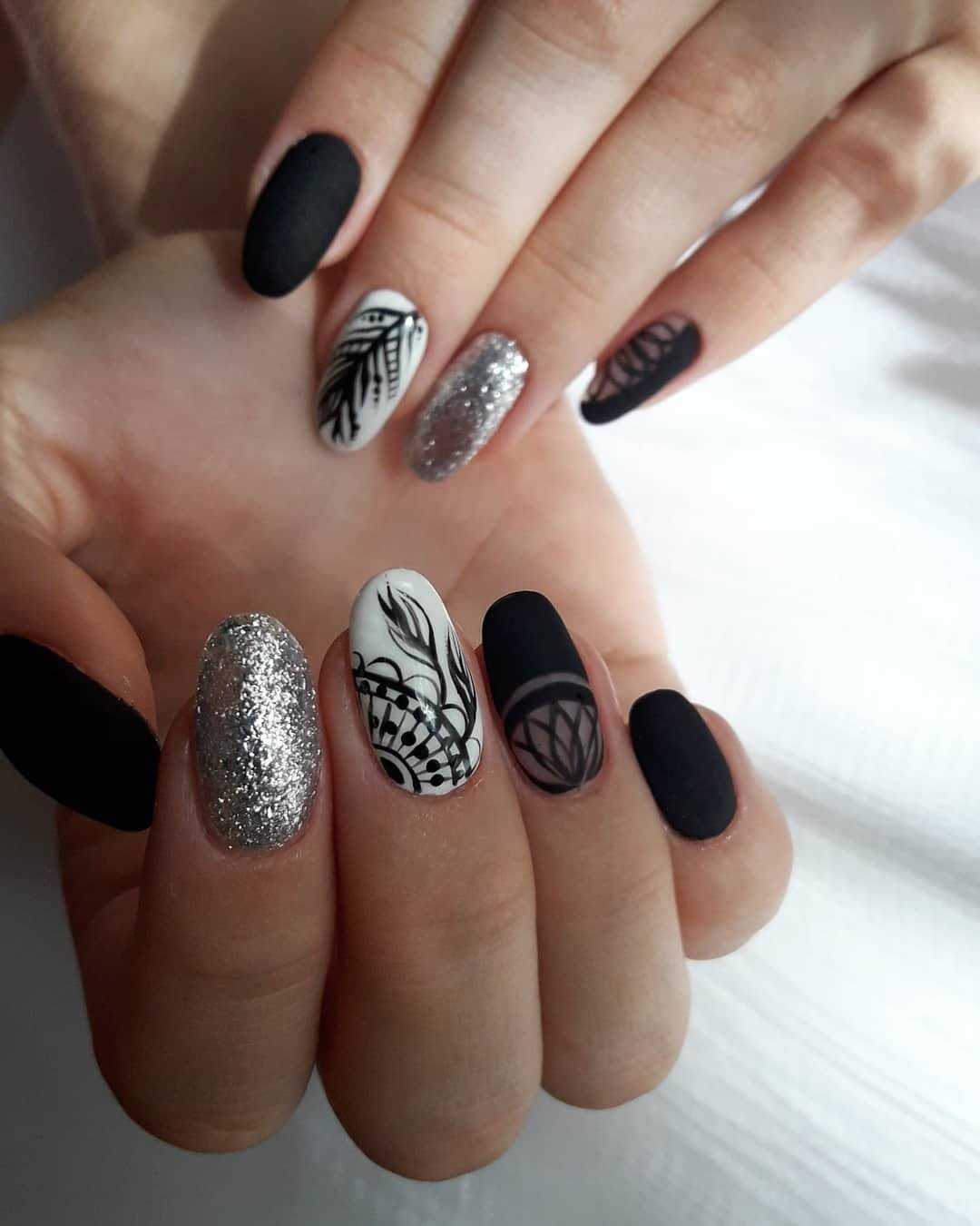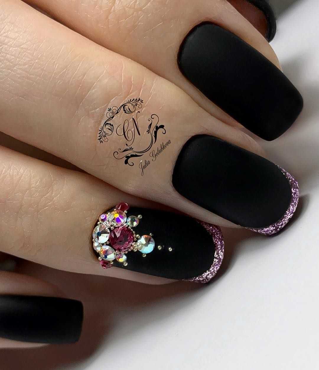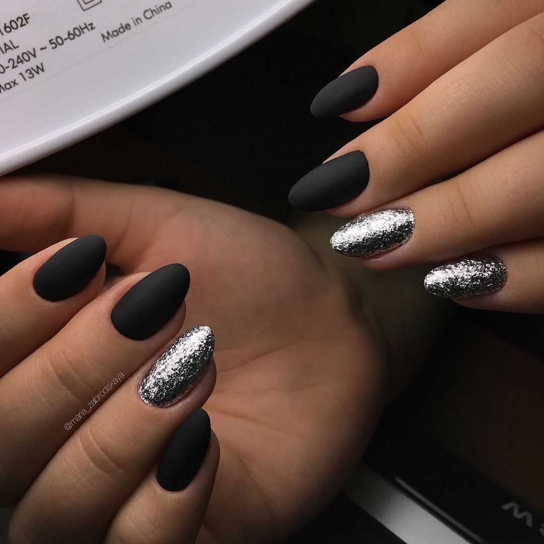 Очень интересен и популярен среди молодёжи чёрный матовый маникюр с блёстками. Лак в таком случае нужно наносить так же, как обычно, но после покрывать ногти специальным покрытием, убирающим ненужный глянцевый блеск. Матовый маникюр выглядит дорого и при этом спокойно. Это идеальный выбор для тех дам, кому нейл-арт не так уж мил. Но иногда можно и разнообразить скромную картину при помощи блёсток или стразиков. Главное, чтобы их было немного. К примеру, можно изобразить в центре одного ногтя звезду или полумесяц.