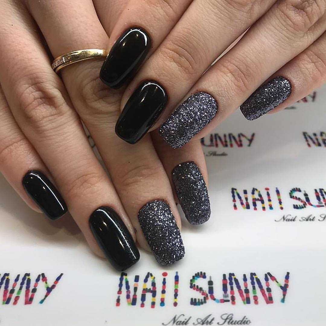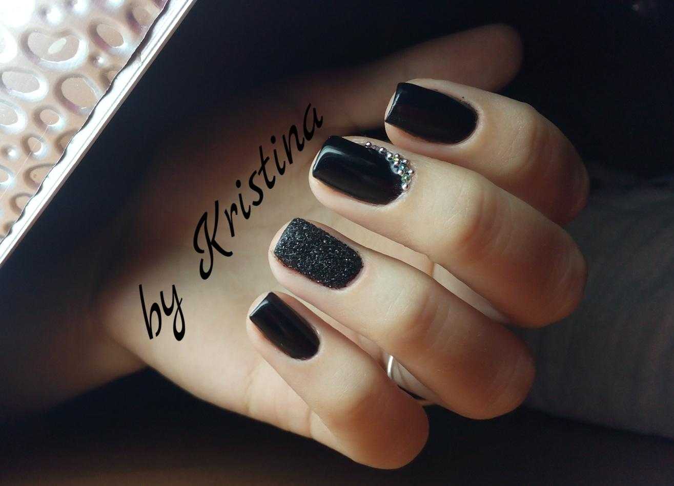 - Чёрный маникюр с эффектом песка – необычное решение для любителей экспериментов. Ногти, украшенные «песком», обретают текстуру, которая напоминает велюр или кашемир.