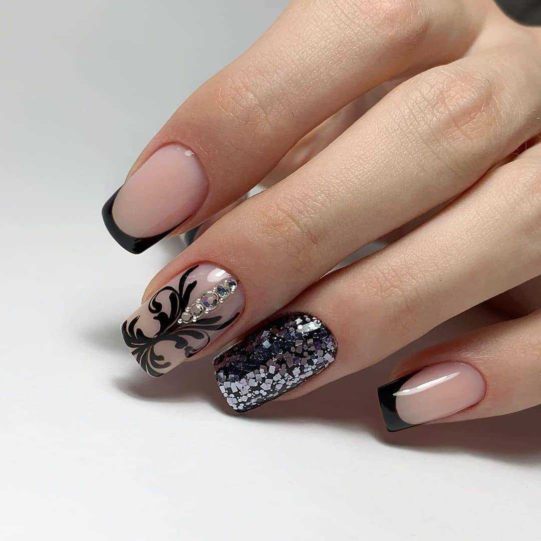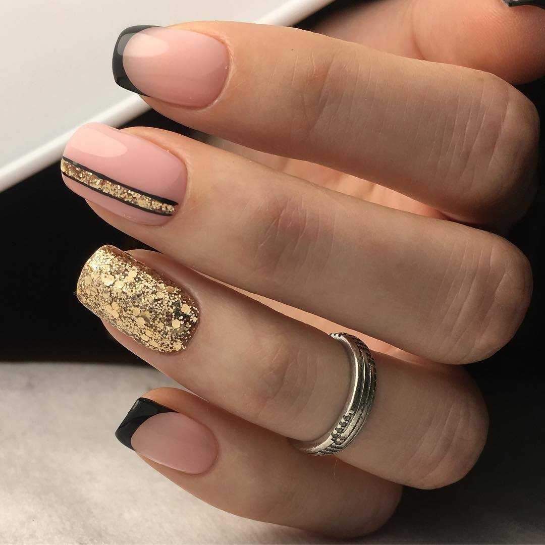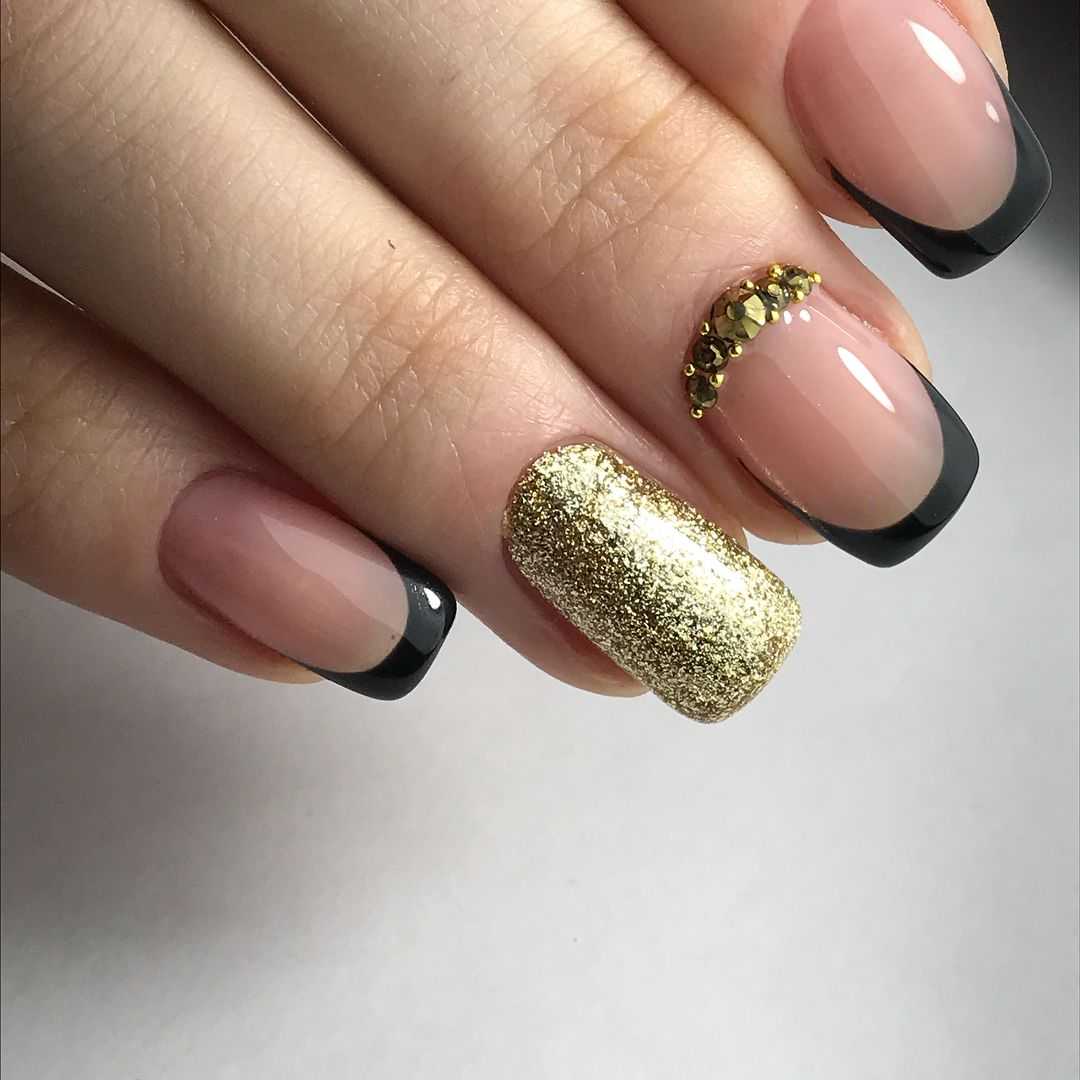 Использование блесток во френче в дизайне маникюра черный с золотом, позволит разнообразить и сделать ваш повседневный маникюр более ярким и праздничным. Предлагаем несколько вариантов покрытия для ярких и праздничных моментов: