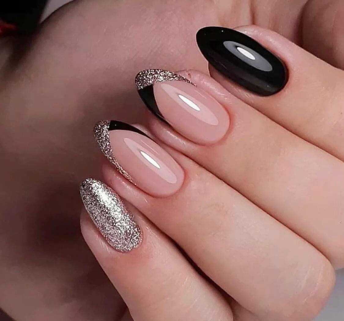 Прекрасное решение — френч в черном цвете на миндаль. Подобный дизайн допускается не делать на всех ноготках, а ограничиться несколькими пальчиками. На остальных пальчиках будут сказочно красиво выглядеть мелкие блёстки либо бархатистое покрытие.