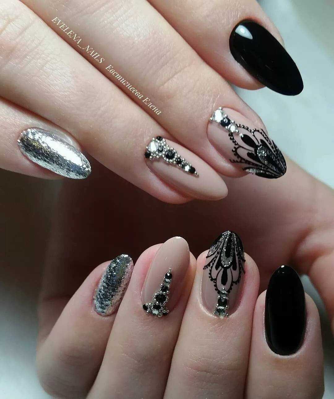 Украшенные темным кружевом или блестками ногти станут прекрасным дополнением к вечернему платью.