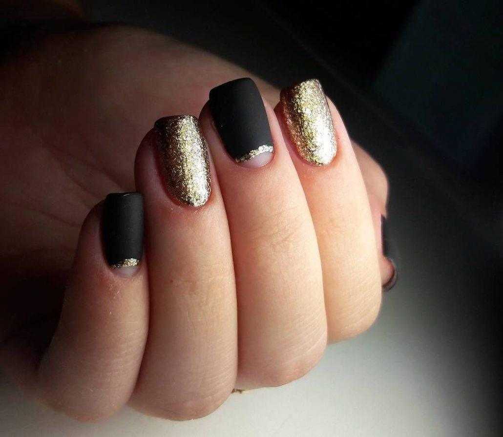 На каждый день можно рассмотреть вариант матового покрытия – здесь уместно будет смотреться матовая черная база, а два или три ноготка можно покрыть золотистым лаком.
