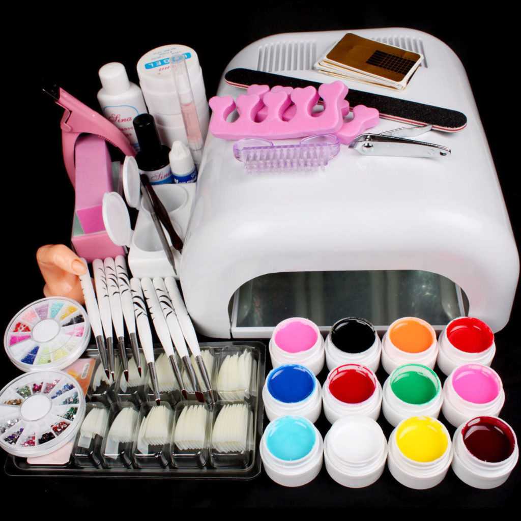 Этот вариант вполне может быть использован профессионалами нейл-арта. Такие наборы для наращивания ногтей могут содержать с своем комплекте помимо лампы мощностью 36 Вт еще и четыре лампы к ней. Также в комплект, как правило, включаются три геля (прозрачный, камуфлирующий и белый) и набор, состоящий из цветных гелей в количестве двенадцати штук. Содержатся в нем и праймер, типсы, жидкость для удаления липкого слоя, клей, пилочки, формочки, наборы кистей, карандаш для кутикулы, щеточка.