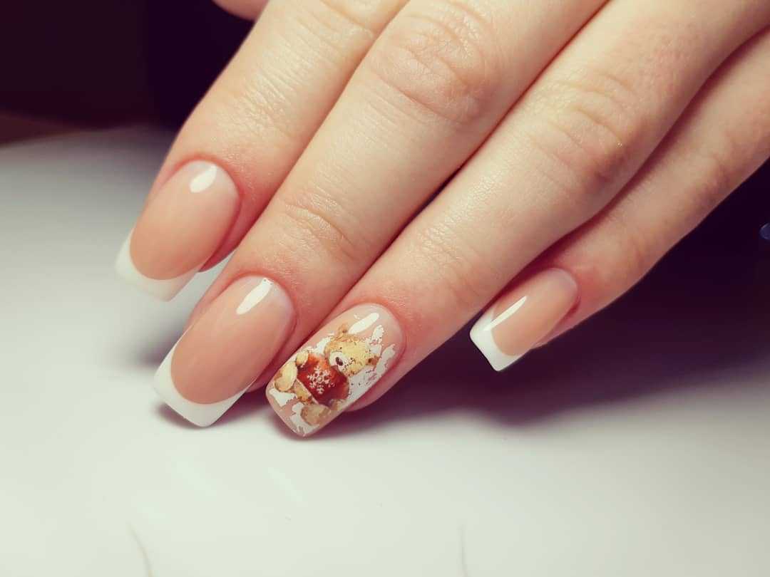 На нынешний сезон предлагаются варианты, в которых классический Френч 2023 на короткие ногти сочетается с росписью, выполненной тонкой кистью лаком белого цвета. Она должен быть исключительно ажурной и напоминать изящное кружево,