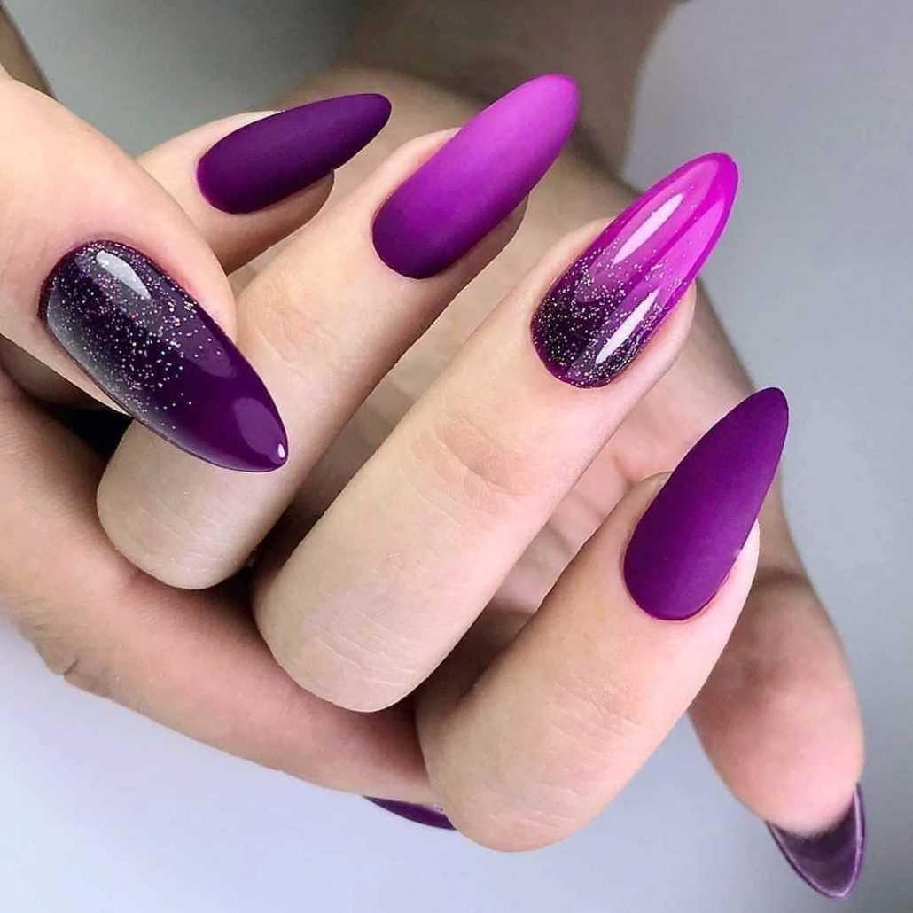 Фиолетовый цвет — самодостаточной. Не стоит перегружать его лишним декором или обилием рисунка. Лучше всего использовать чистый, классический тон, который подойдет на разную форму и длину ногтей.