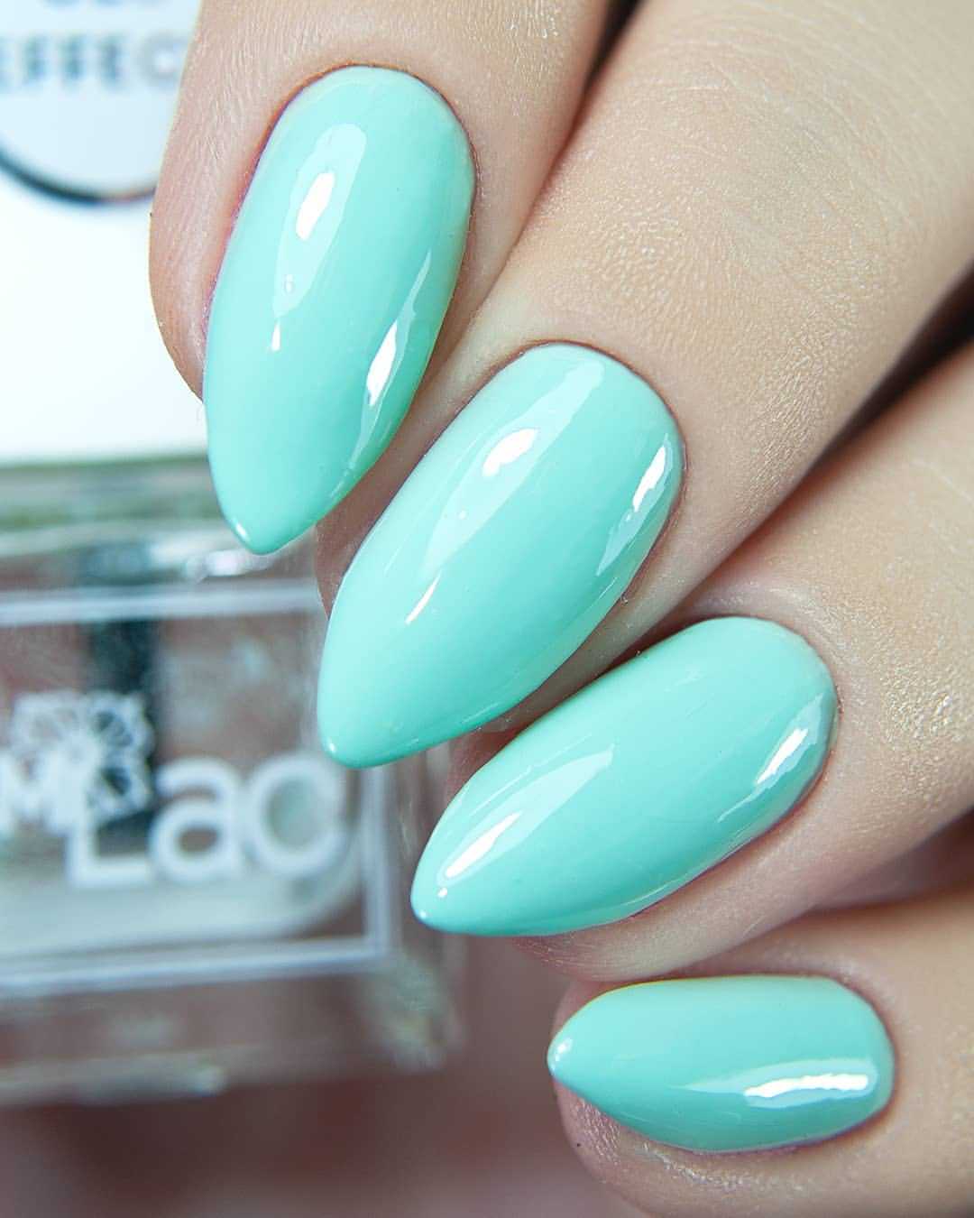 Миндалевидная форма ногтей является одной из самых выигрышных форм, на которой можно делать абсолютно любой дизайн. В летнее время года подойдут, как неоновые, так и пастельные оттенки мятного маникюра для миндалевидной формы ногтей. Можно создать радужный маникюр используя сразу 4 или 5 лаков мятного цвета с разными оттенками.