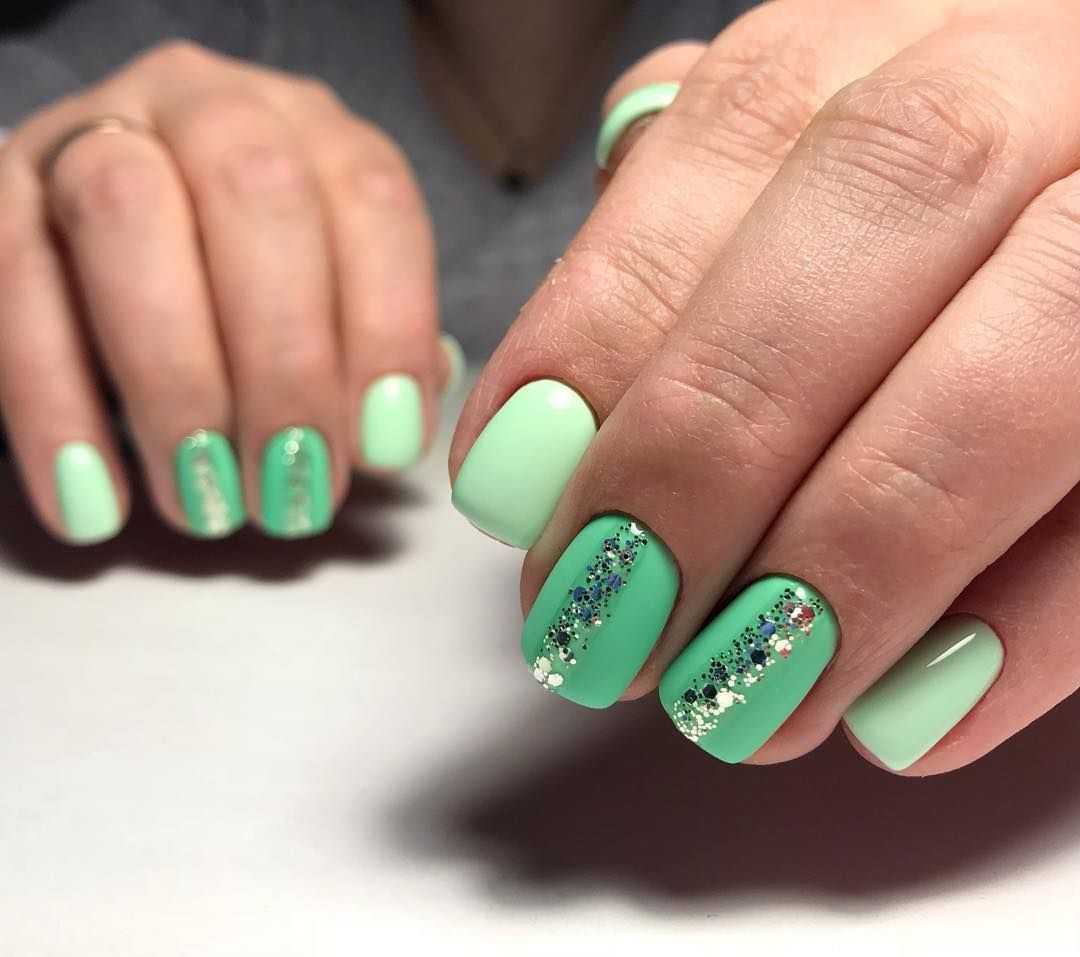 Зелёные однотонные ноготки без всяких сомнений смотрятся очень красиво, но большинство модниц всё-таки предпочитают украшать покрытия всевозможным дизайном, поэтому мы дополнительно предлагаем вниманию наших читательниц модные идеи зелёного нейл-арта с блёстками и рисунками, среди которых каждая барышня найдёт для себя идеальный вариант. Среди актуальных идей можно отметить всевозможные сезонные изображения, геометрические мотивы, флористику и рисунки в стиле минимализм, которые выбираются на основании личных предпочтений и настроения каждой дамы.