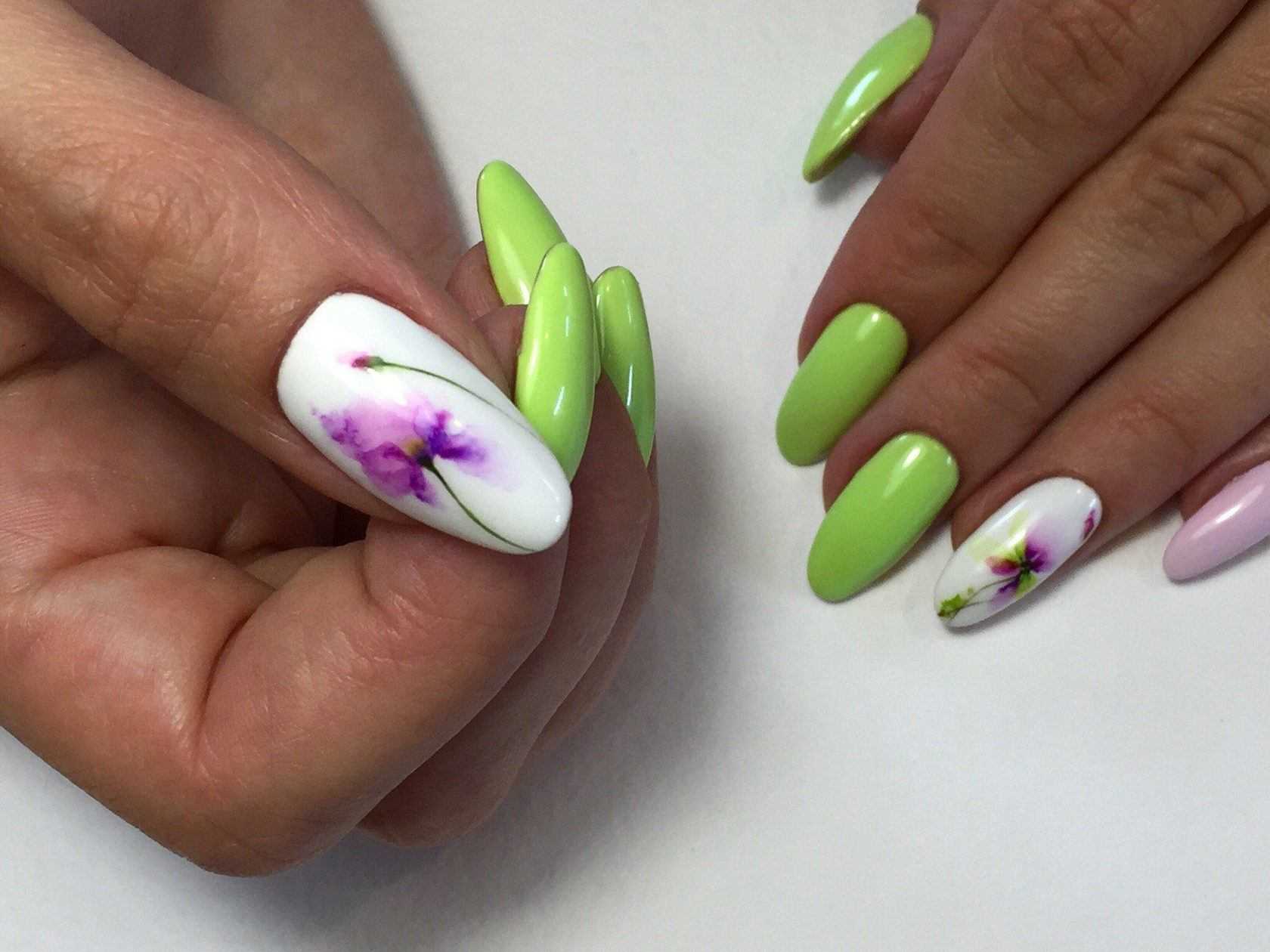 Зеленый маникюр с акварельными цветами смотрится утонченно и стильно. Используйте для маникюра нежные оттенки зеленого в сочетании с белым цветом. Белый может случить в качестве фона для зеленых цветов или наоборот, выполняйте белые цветы на светло-зеленом фоне.