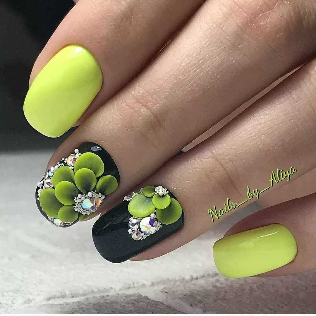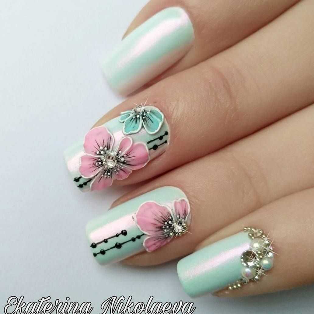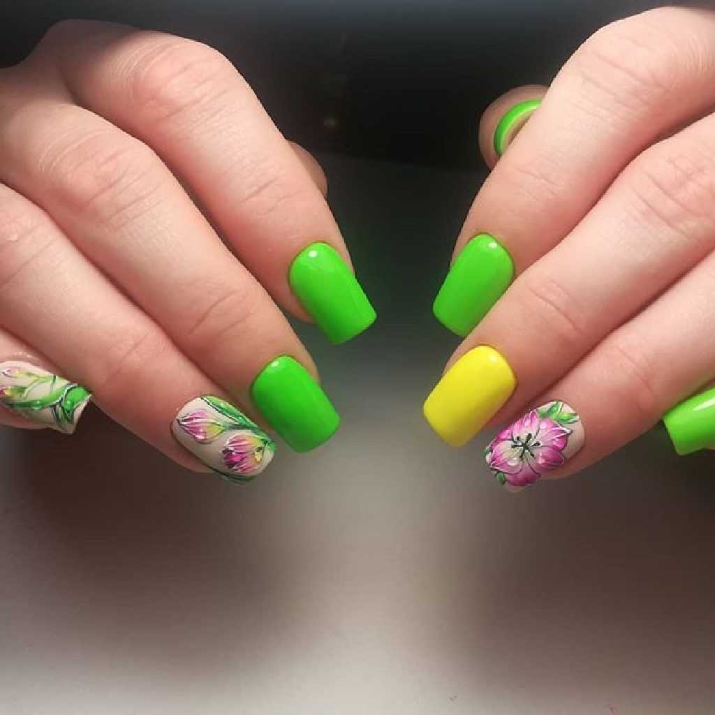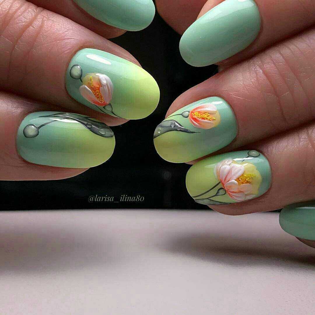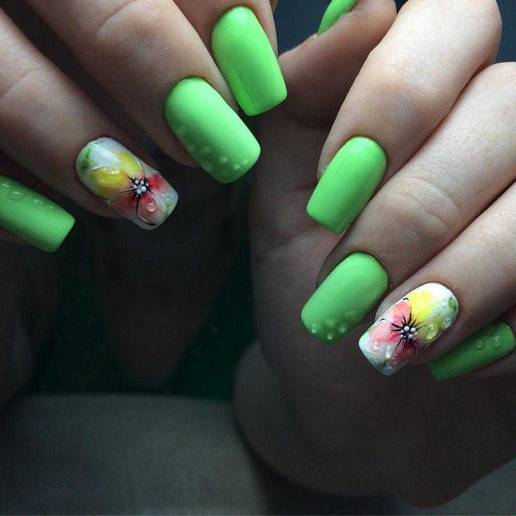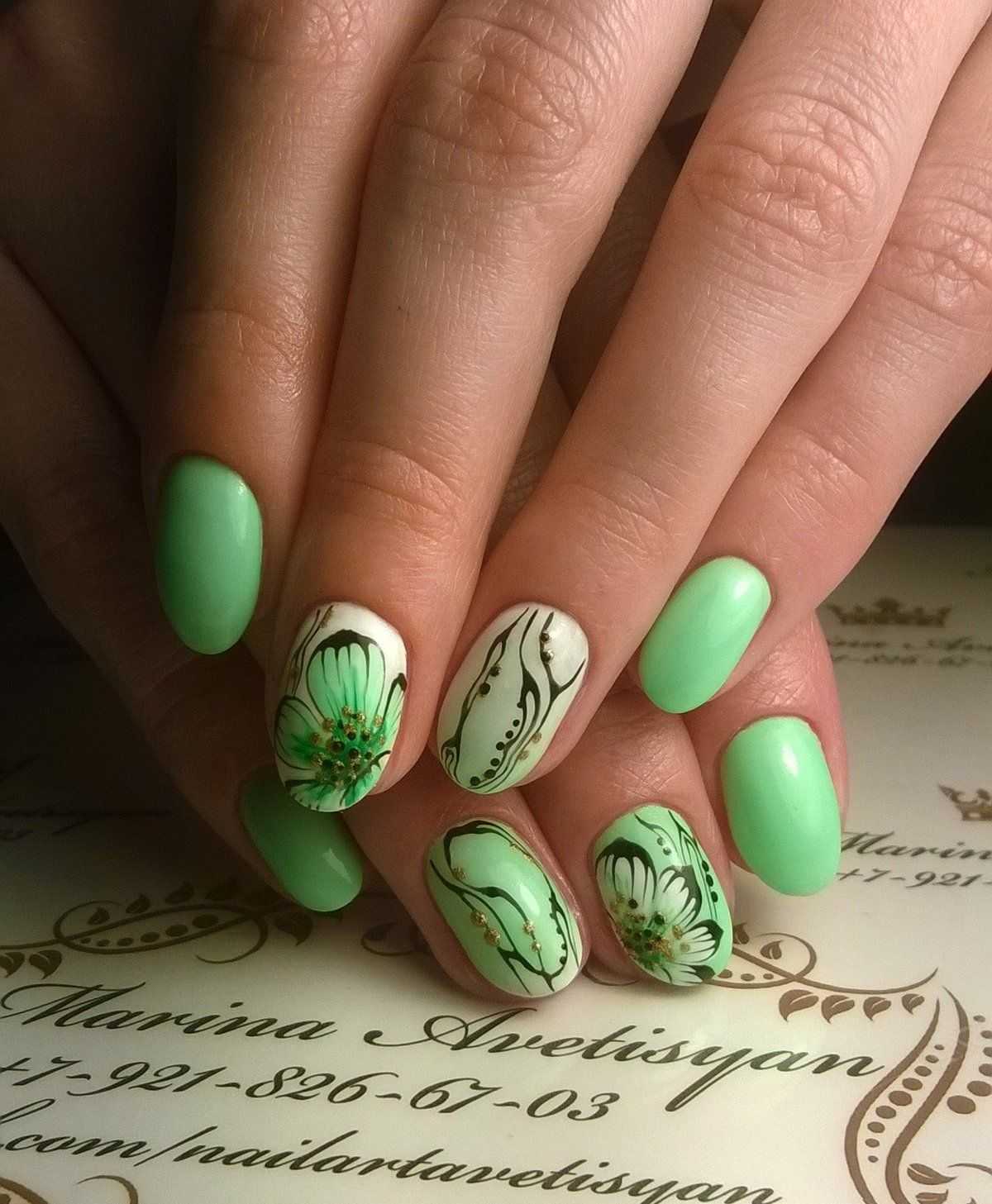 Зеленый маникюр с цветами пользуется невероятной популярностью среди ярких и неординарных особ. Такой маникюр в сочетании с цветочными рисунками создает невероятную композицию. Фантастический маникюр в зеленой палитре можно смело сочетать с другими цветами, а также применять декор в виде страз, бусинок, камифубуков, конфетти и глиттера. Нежный и невероятный дизайн утонченно впишется в различные образы и подчеркнет изящность и неординарность девушки.
