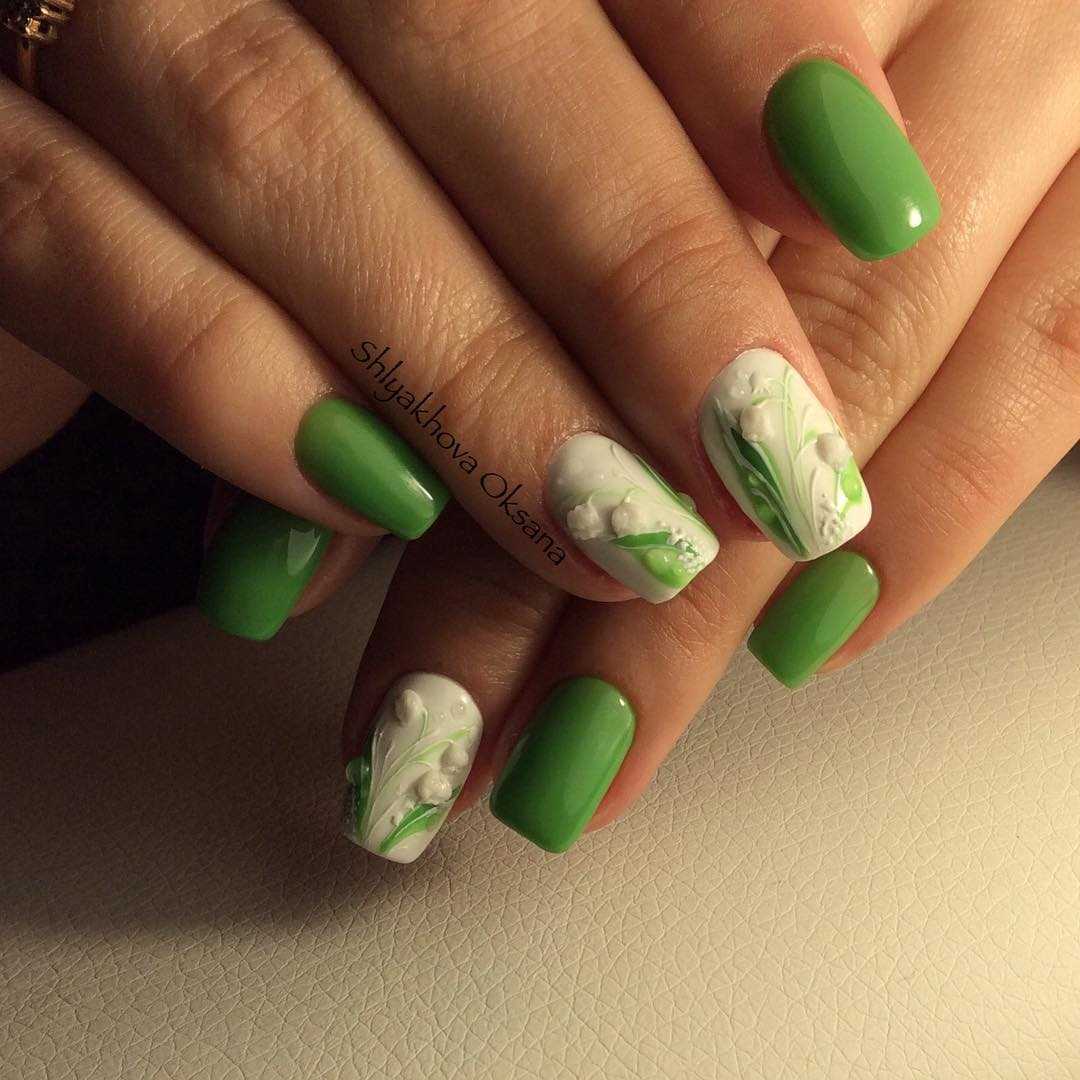 Самый простой способ в плане решения использования зеленого цвета в маникюре, но при этом самый непростой в отношении техники исполнения – дизайн ногтей с зеленым цветом (фото). Дизайн может быть нескольких вариантов – рисунок контрастного цвета на зеленом фоне, или наоборот, зеленый цвет может использоваться в качестве акцента на ногтях, окрашенных в оттенок отличного зеленого спектрального ряда. Но, пожалуй, самый интересный вариант будет достигнут при использовании разных оттенков зеленого в одном маникюре.