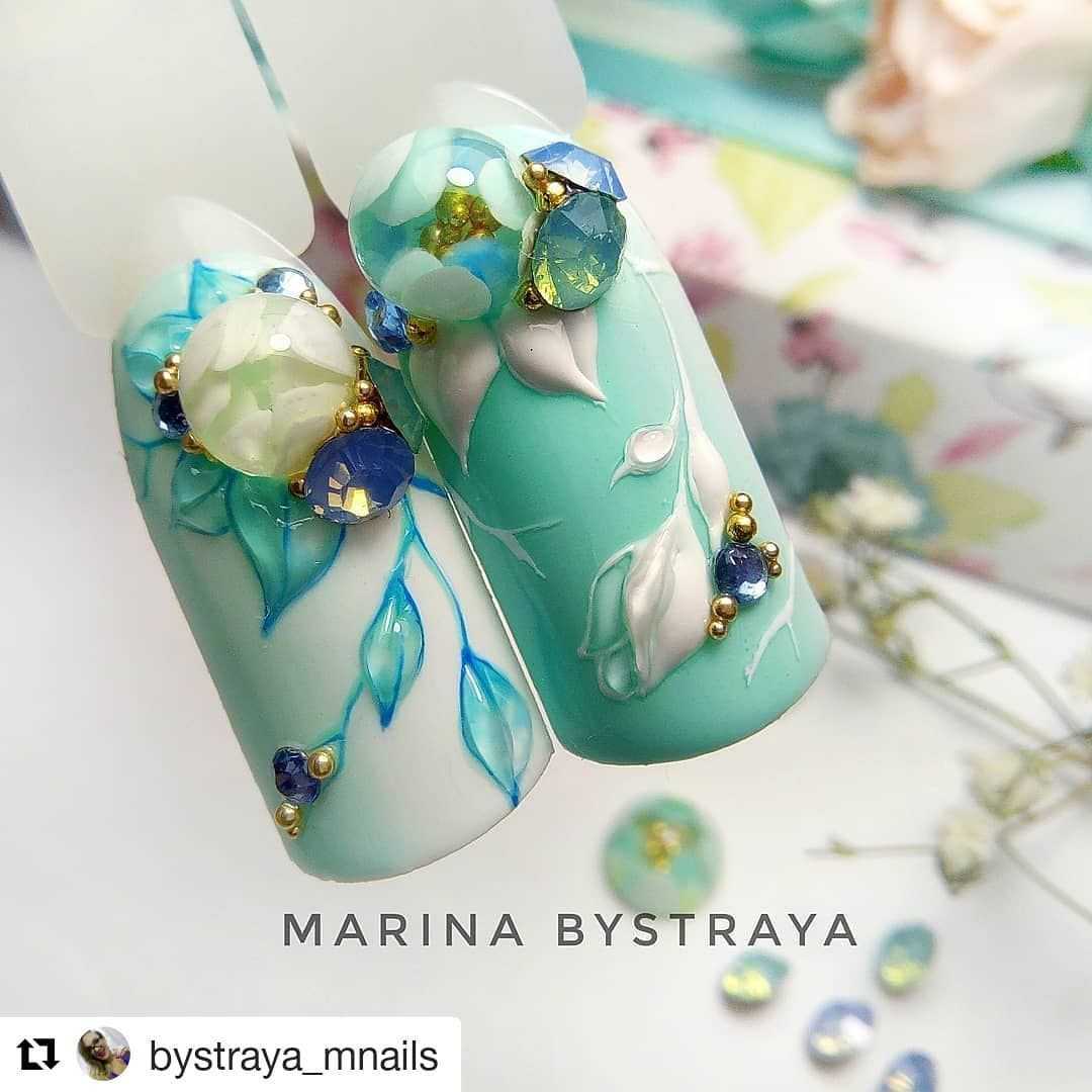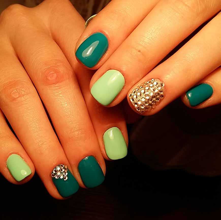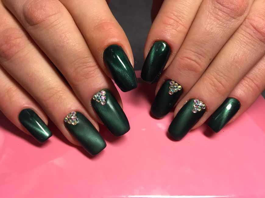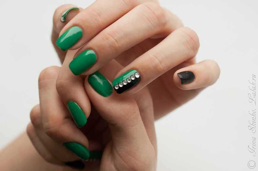 Неплохо смотрится дополнение зеленых тонов сверкающими декоративными элементами. Стразы, например, шикарно смотрятся как на глянцевом, так и на матовом фоне. Еще можно взять бульонки. Они помельче размером, что помогает им лучше держаться на ноготках, ведь такие бусинки, в отличие от стразов, можно заливать топом прямо поверх.