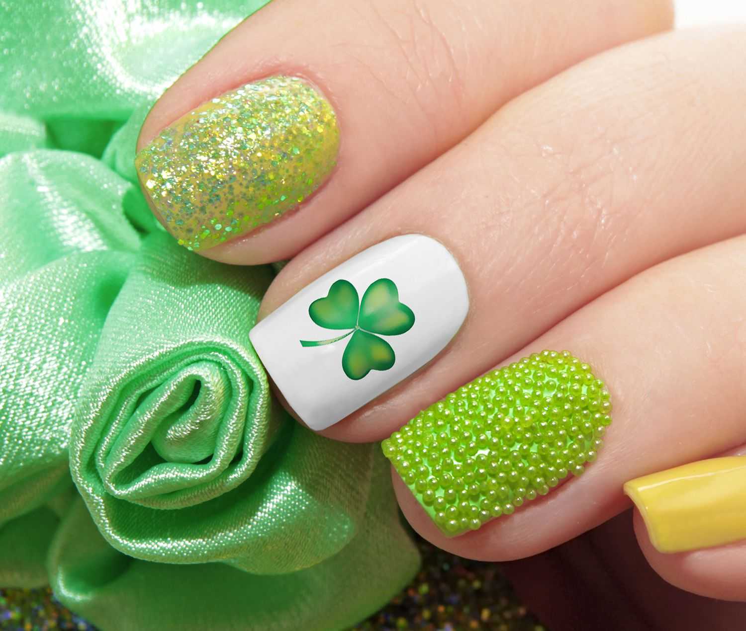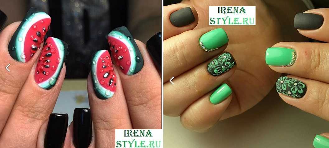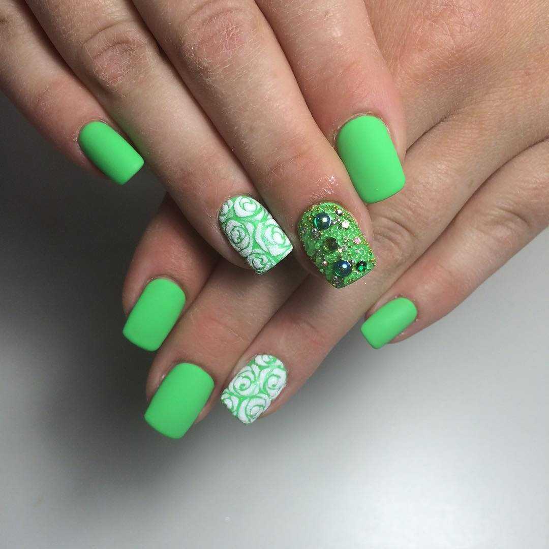 Зеленый маникюр очень подходит для новогоднего дизайна: нарисованные или наклеенные на ногтях ёлочки, игрушечные шары, звёздочки, гирлянды, снежинки смотрятся чудесно и сказочно. Горошек, клеточки, полоски, геометрические узоры, рисунок в виде фруктов (яблоки, киви, лайм), стразы, бусинки, блёстки, разноцветное кружево — экспериментировать можно до бесконечности, главное, чтобы ногти не стали одним блестящим пятном.