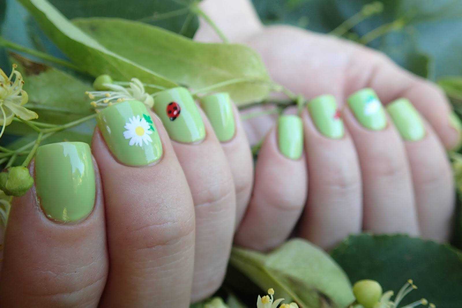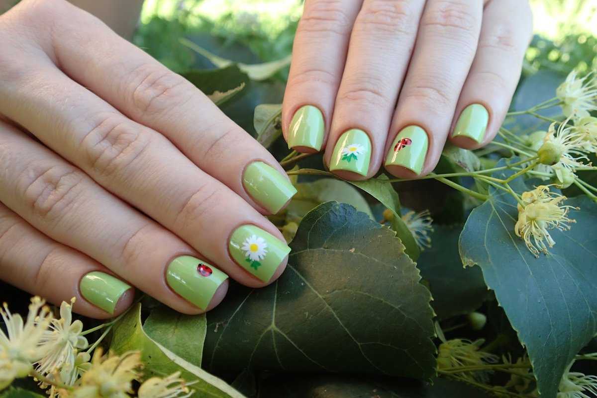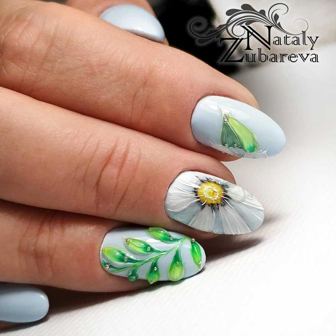 Выполнить дизайн с полевыми цветами можно самостоятельно. Самый простой способ – это использовать дотс. С помощью этого инструмента нарисуйте мелкие белые ромашки. Если хотите дизайн посложнее, то используйте готовые слайдеры для ногтей с уже готовым рисунком с полевыми цветами. Для маникюра можно использовать как светлые оттенки зеленого, так и потемнее.
