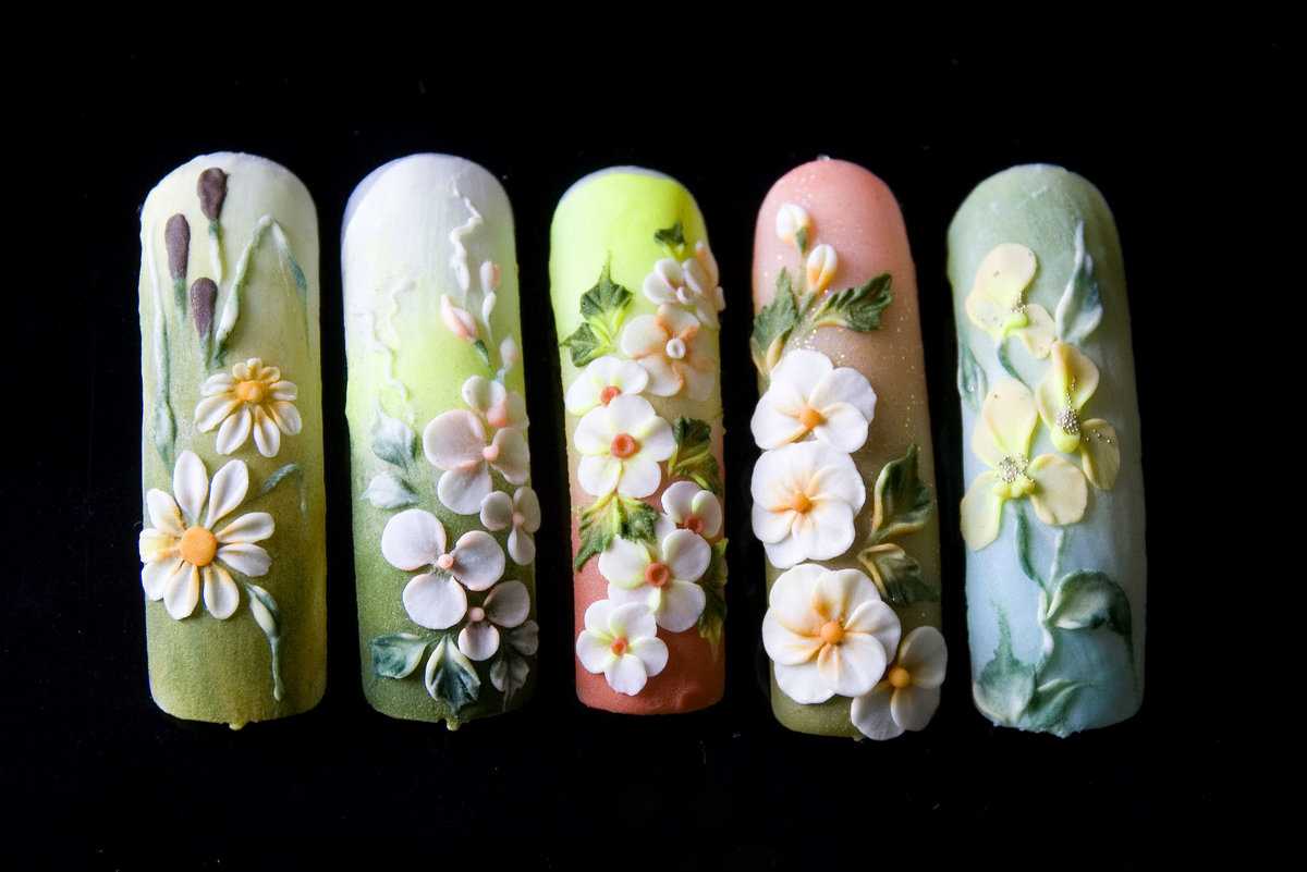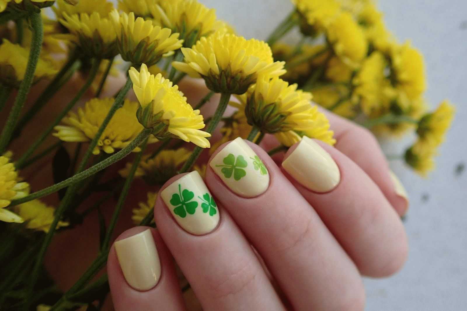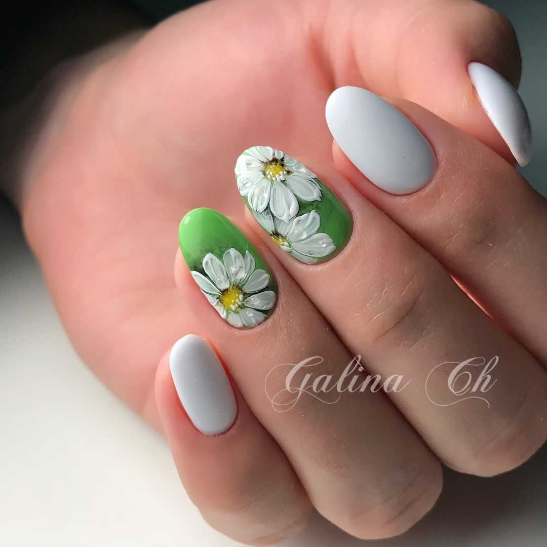 Выполнить дизайн с полевыми цветами можно самостоятельно. Самый простой способ – это использовать дотс. С помощью этого инструмента нарисуйте мелкие белые ромашки. Если хотите дизайн посложнее, то используйте готовые слайдеры для ногтей с уже готовым рисунком с полевыми цветами. Для маникюра можно использовать как светлые оттенки зеленого, так и потемнее.