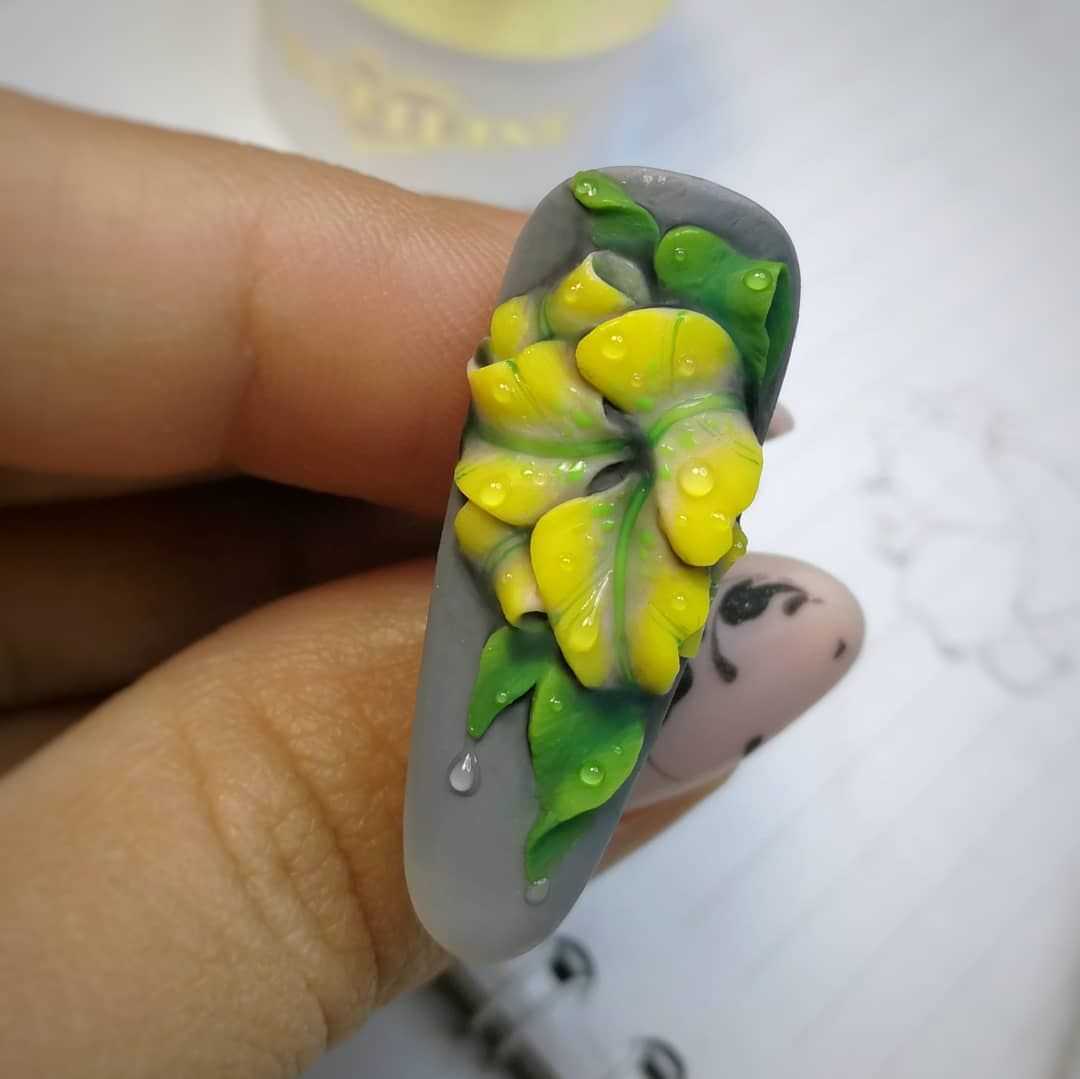 Используйте для дизайна крупные цветы, например, лилии, розы, орхидеи. Дополните маникюр каплями прозрачного топа, имитирующие росу или капли дождя