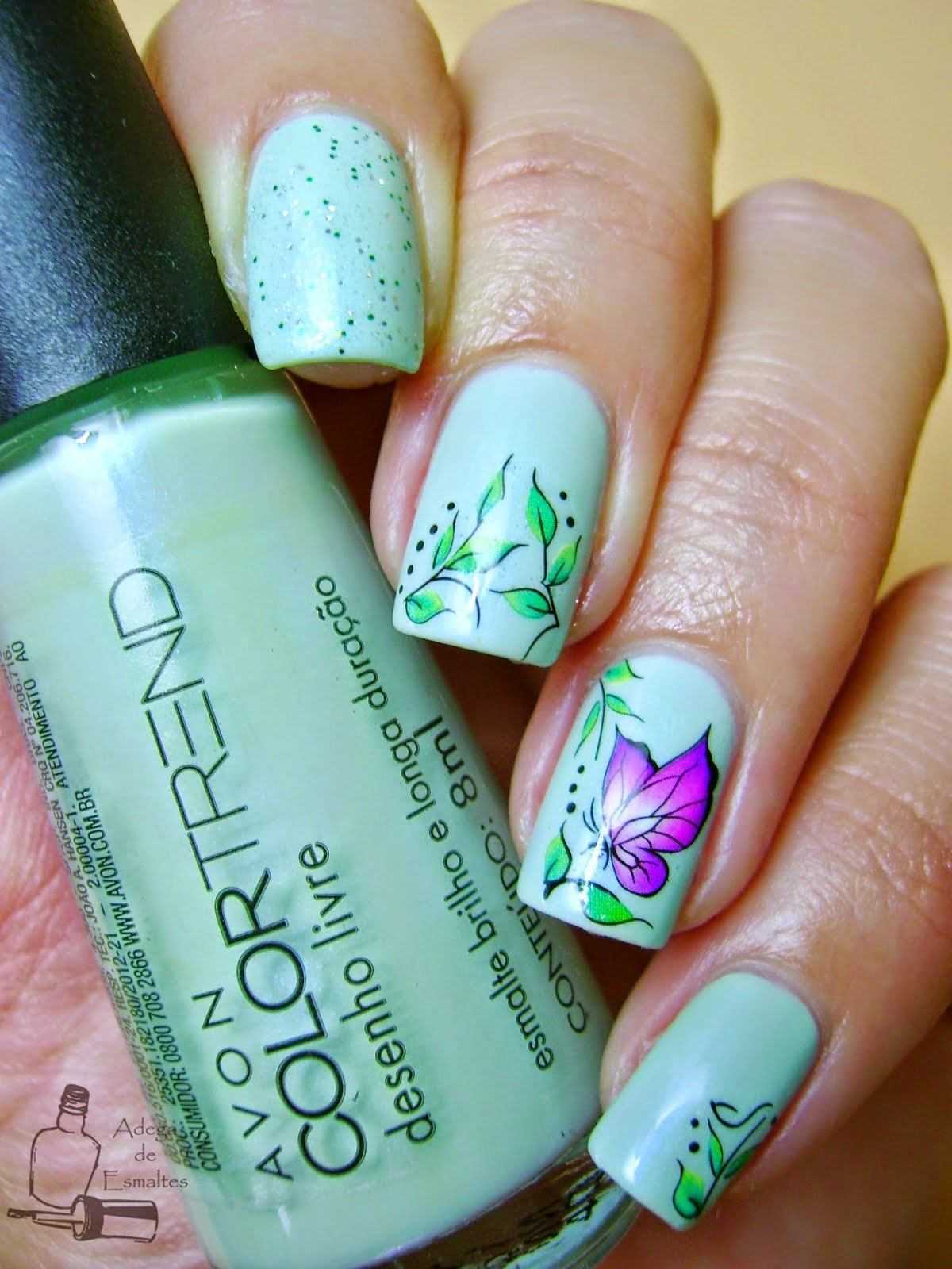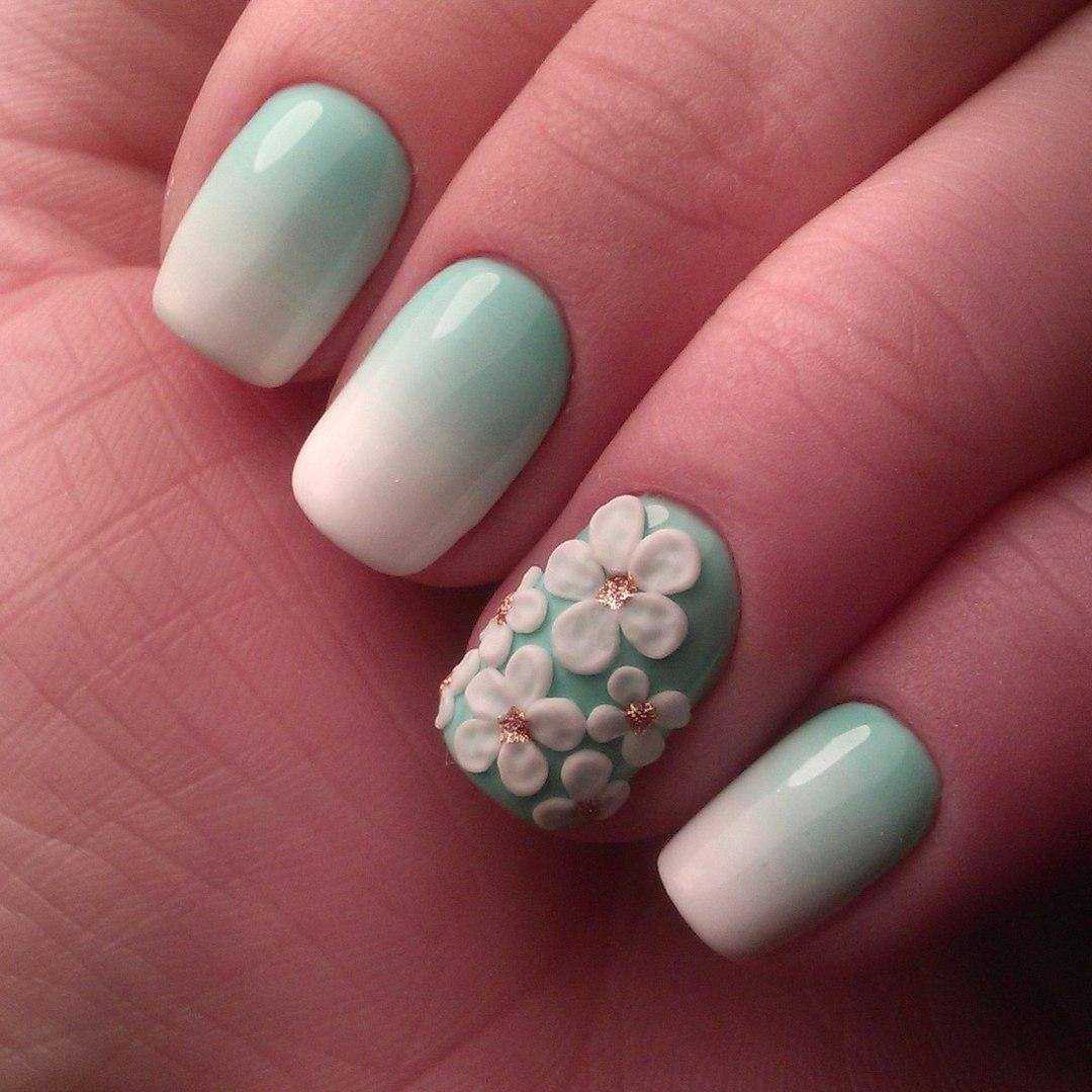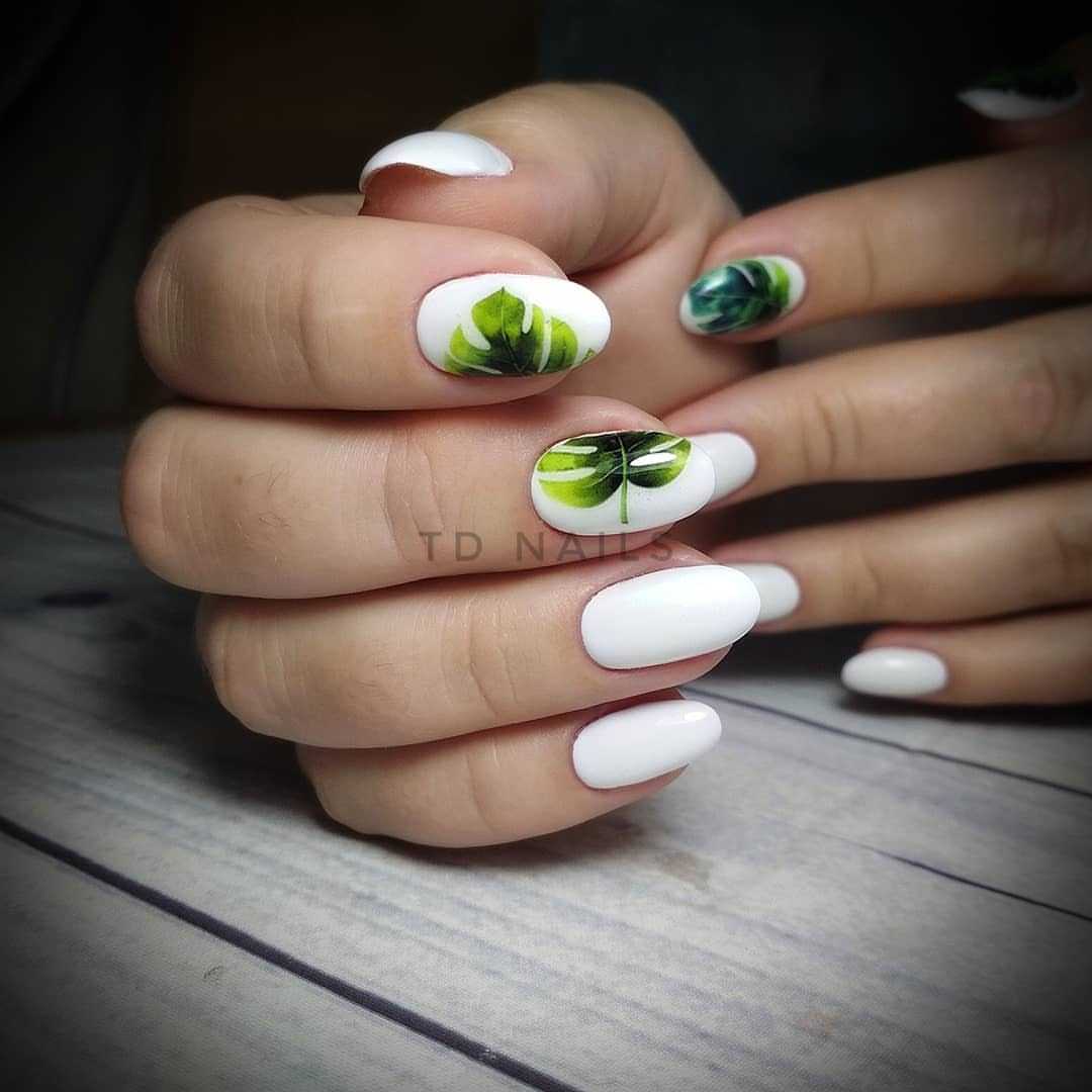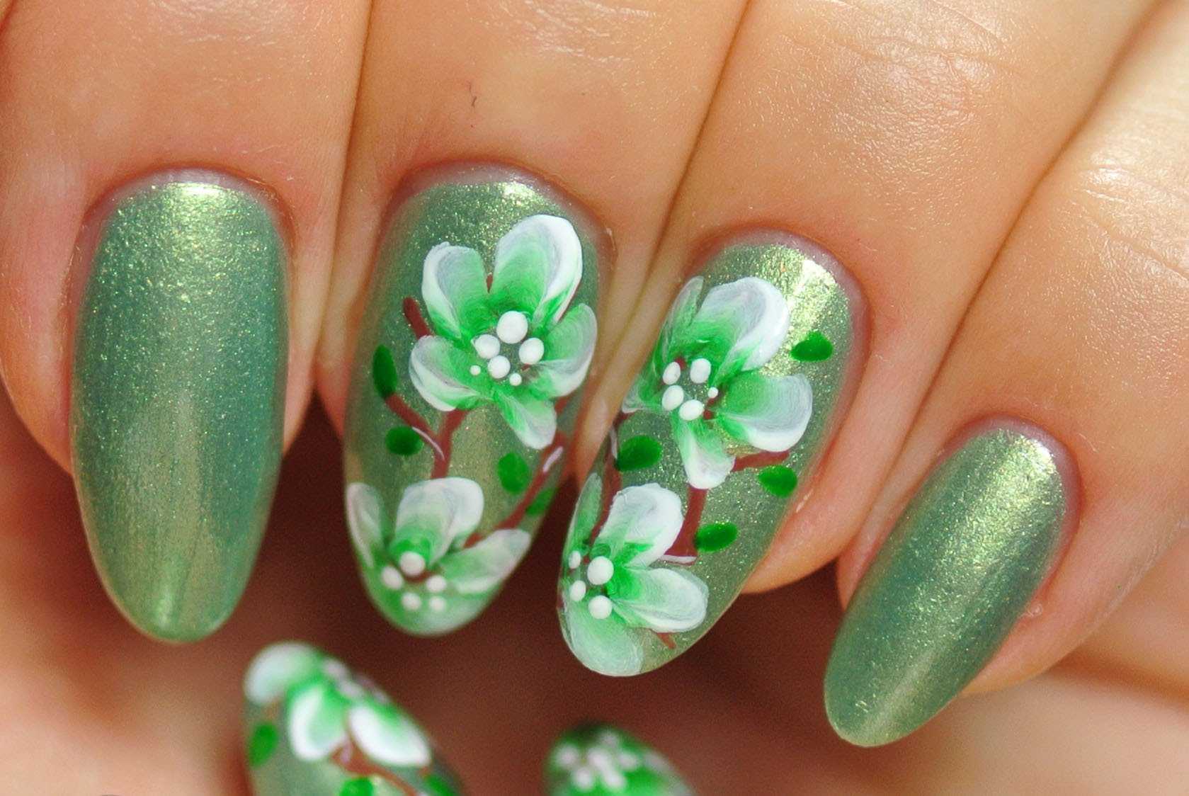 Зеленый маникюр с акварельными цветами смотрится утонченно и стильно. Используйте для маникюра нежные оттенки зеленого в сочетании с белым цветом. Белый может случить в качестве фона для зеленых цветов или наоборот, выполняйте белые цветы на светло-зеленом фоне.