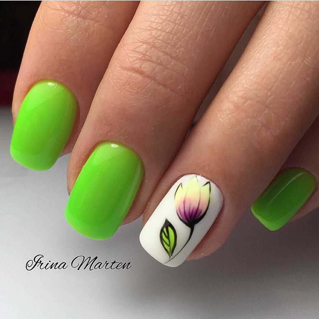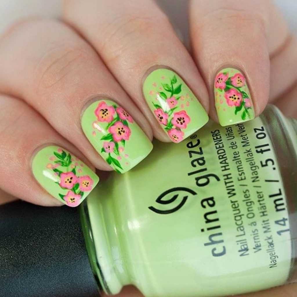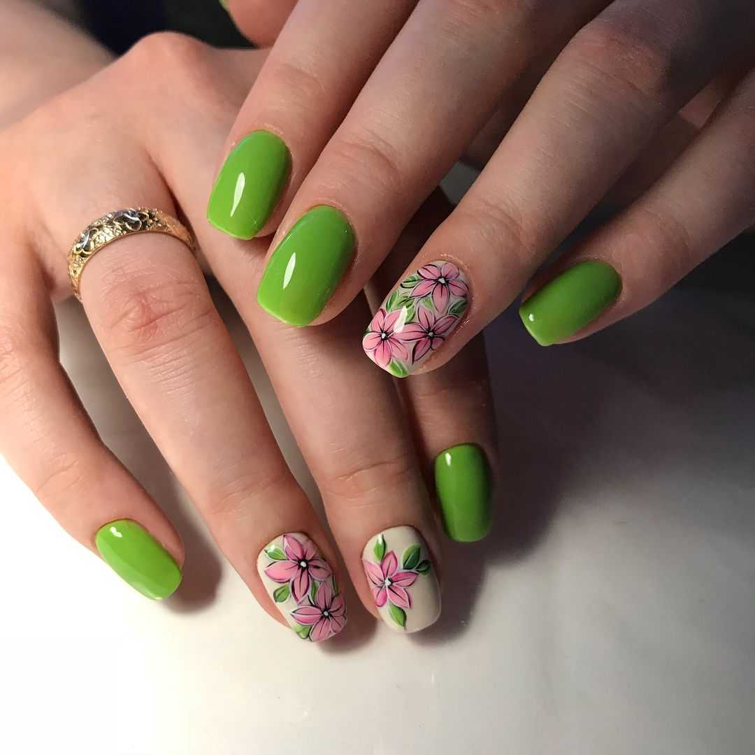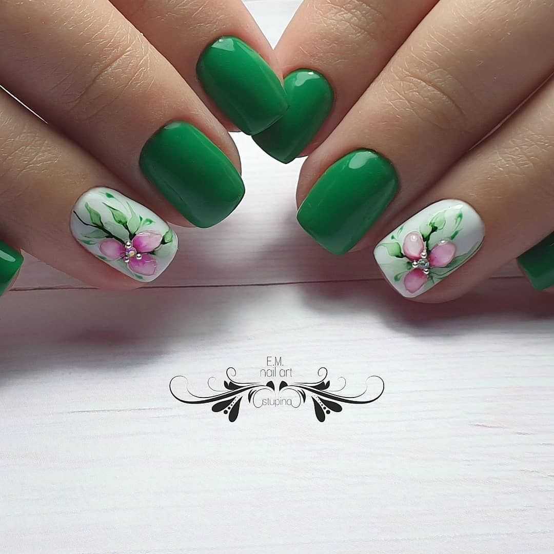 Цветочки, листики и веточки идеально сочетаются с зеленой основой ноготков. Наиболее актуален такой дизайн для летнего и весеннего времени года. Для выполнения флористических рисунков на зеленом фоне можно использовать белый, красный, желтый, розовый или пурпурный цвет. Цветочными рисунками можно украсить всего один или несколько ноготков в виде акцента. В качестве декора для данного дизайна можете смело использовать камни, стразы, втирку или акриловую пудру. Зеленый маникюр с цветами удачно сочетать с другими техниками выполнения нейл-арта, например, французским маникюром, геометрическим дизайном или стемпингом.
