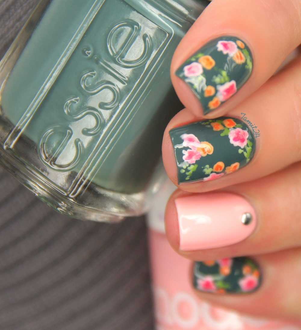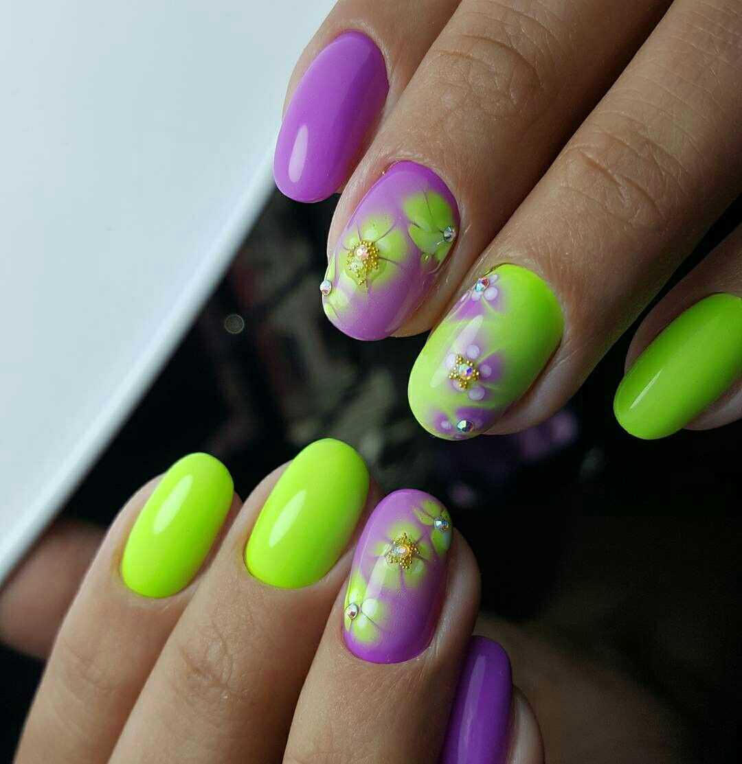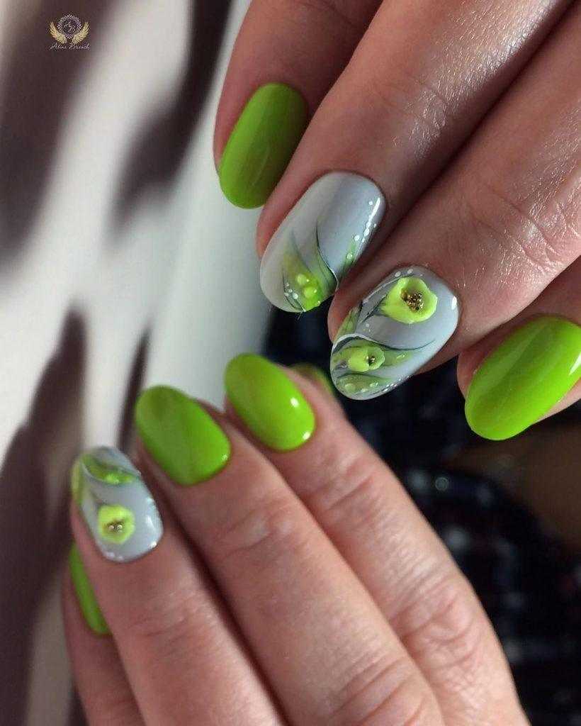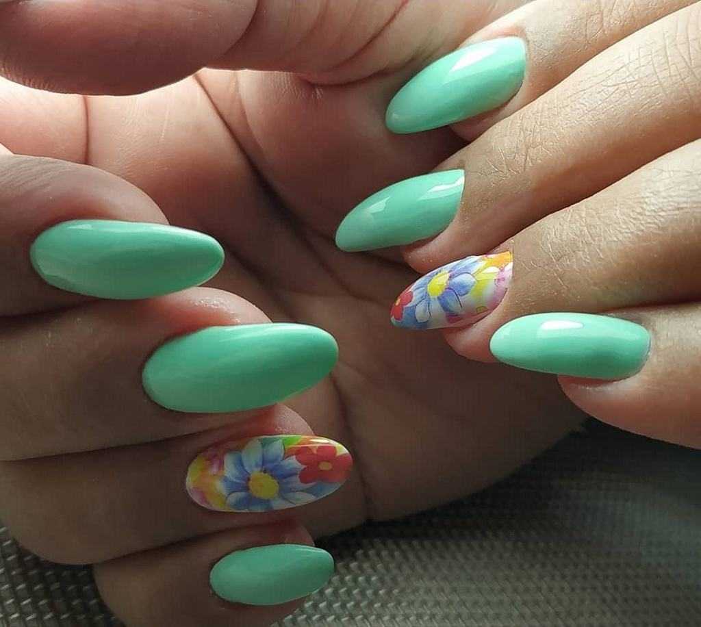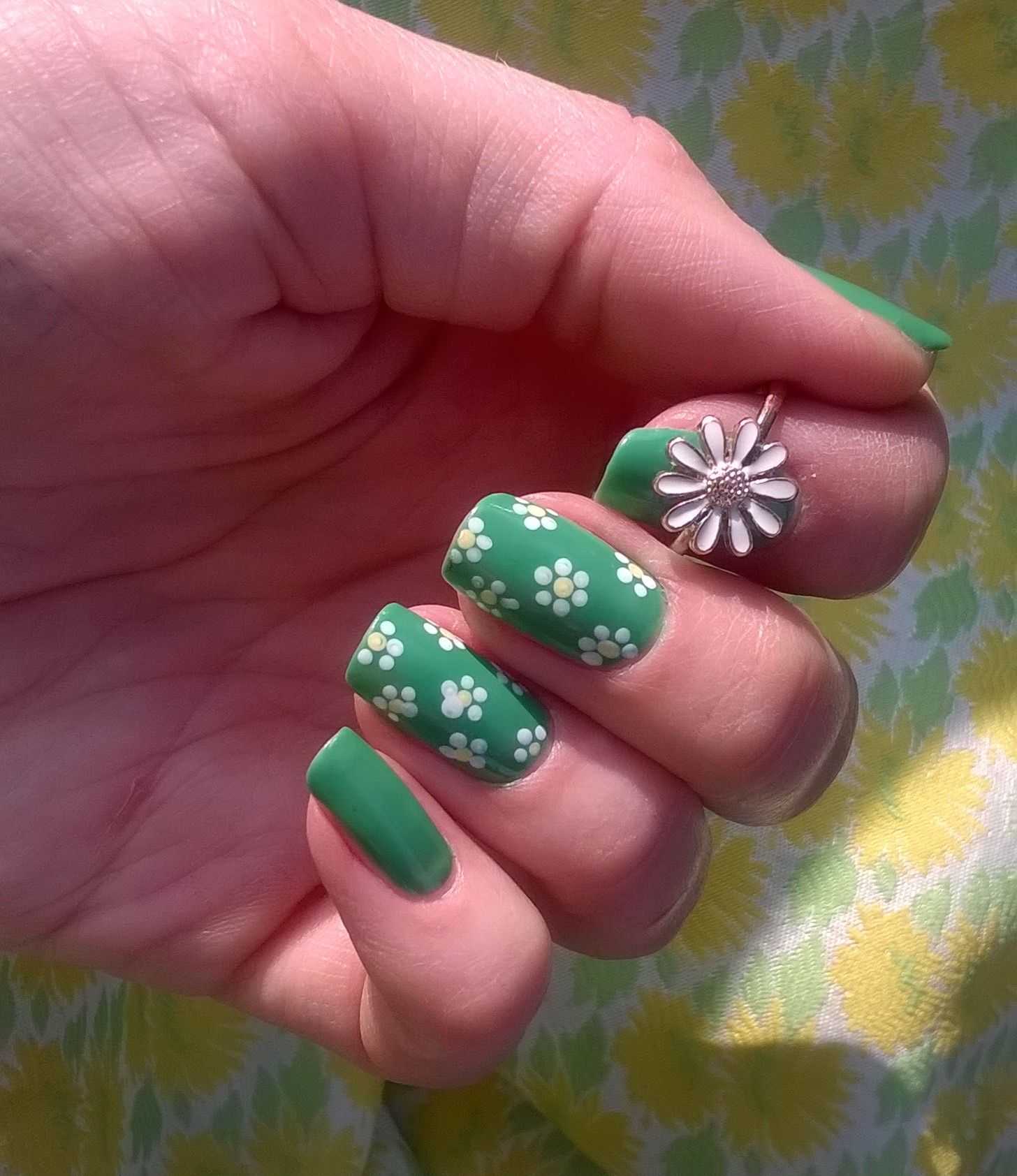 Цветочки, листики и веточки идеально сочетаются с зеленой основой ноготков. Наиболее актуален такой дизайн для летнего и весеннего времени года. Для выполнения флористических рисунков на зеленом фоне можно использовать белый, красный, желтый, розовый или пурпурный цвет. Цветочными рисунками можно украсить всего один или несколько ноготков в виде акцента. В качестве декора для данного дизайна можете смело использовать камни, стразы, втирку или акриловую пудру. Зеленый маникюр с цветами удачно сочетать с другими техниками выполнения нейл-арта, например, французским маникюром, геометрическим дизайном или стемпингом.