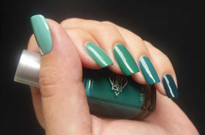 Обратите внимание на то, какие цвета сочетаются с темно-зеленым. Если это холодный изумрудный оттенок, то дополнить его вы можете лаками из фиолетовой гаммы (как светлыми вроде лавандового, так и потемнее), розовыми тонами, синим, бордовым, бежевым.
