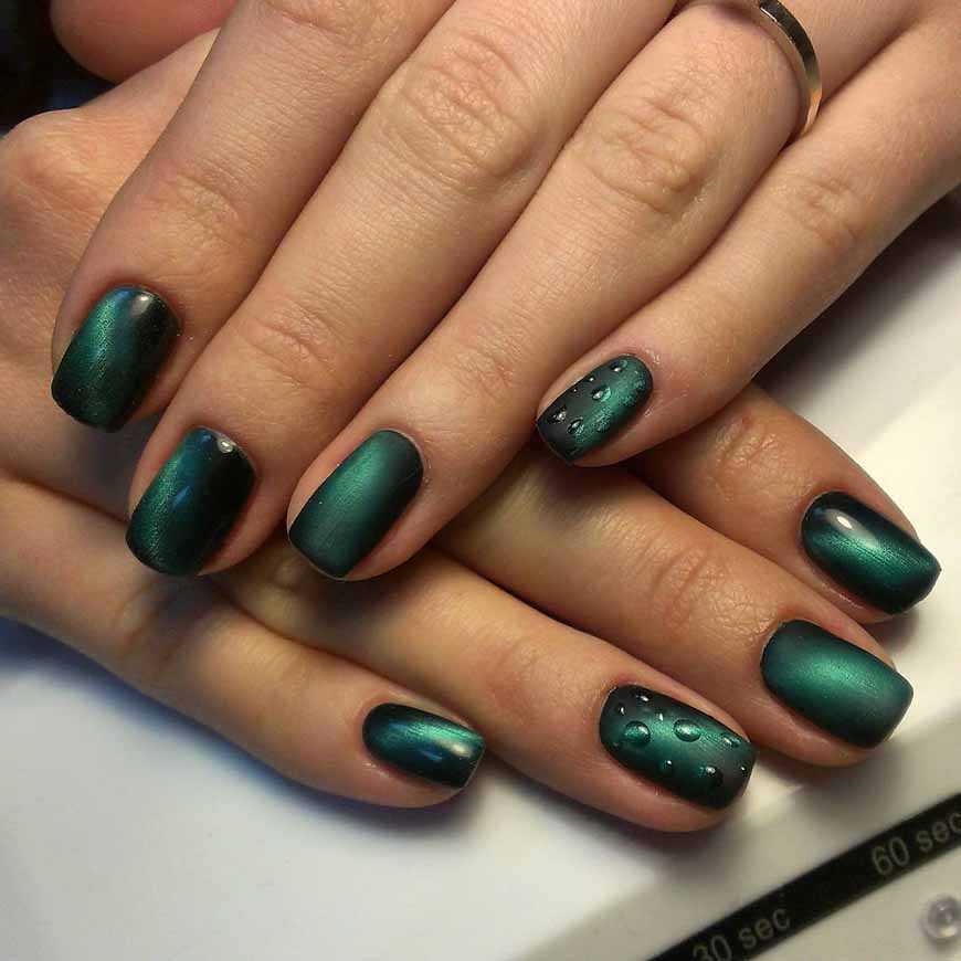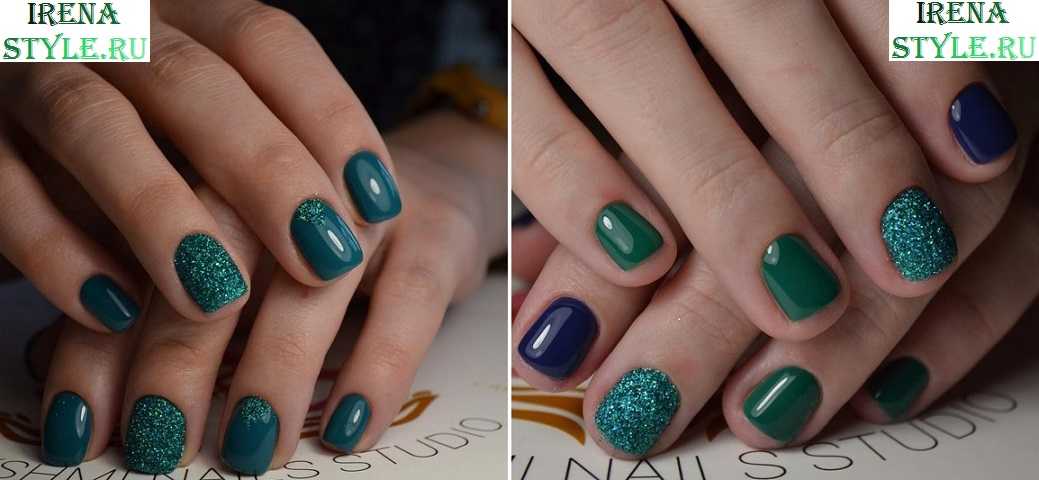 Еще один главный тренд в зеленом маникюре – использование эффекта битого стекла. Подобный вариант смотрится особенно выигрышно в темном исполнении. В случае с темно-зеленым лаком он дает богатые переливы синего, черного и фиолетового цветов.