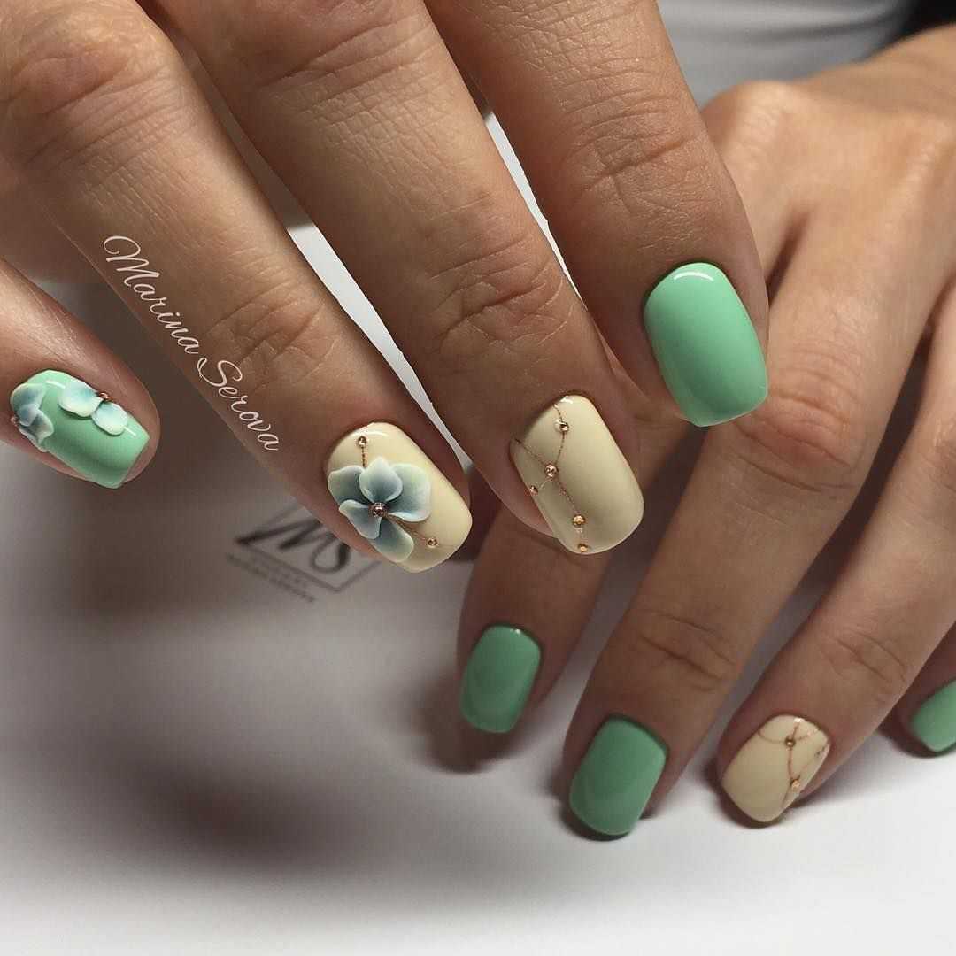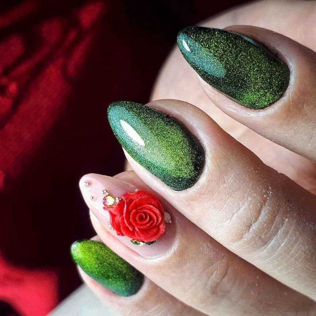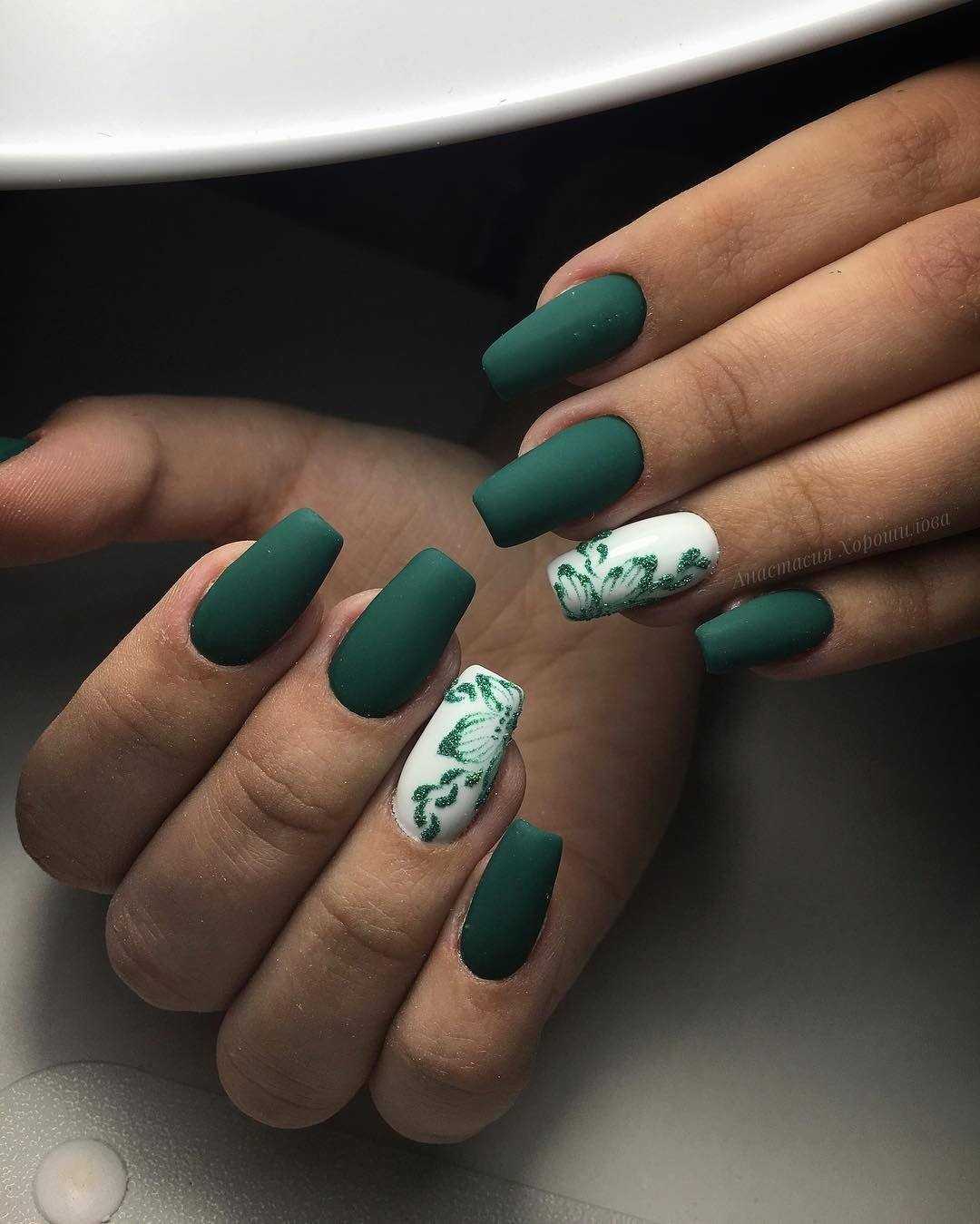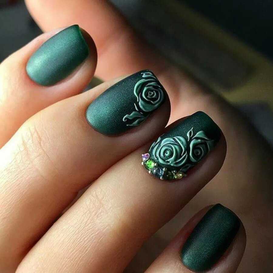 Зеленый маникюр очень хорошо смотрится в сочетании с элегантным бархатистым покрытием, особенно с темными тонами. При этом, если сочетать яркие оттенки зеленого цвета с матовой поверхностью, то получится очень красивый и сдержанный дизайн. При дополнении зеленого матового маникюра роскошными цветами можно получить невероятный и шикарный маникюр для вечерних и праздничных мероприятий. Оттенок цветов при этом может быть любым. Очень изящно будут смотреться композиции из лепки или узоры стемпинга. Несколько бусинок или небольших камешков придадут маникюру элегантность и шарм.
