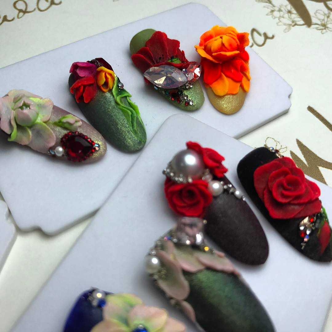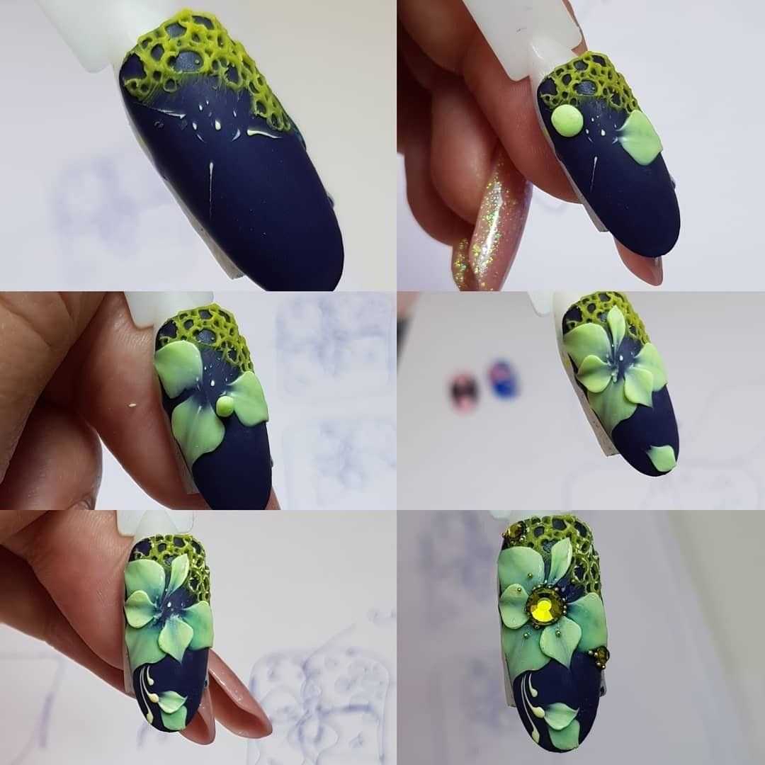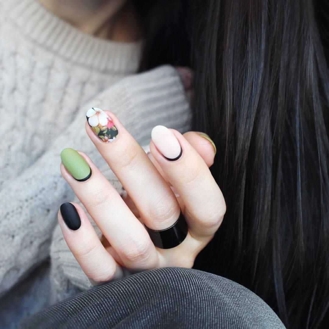 Зеленый маникюр очень хорошо смотрится в сочетании с элегантным бархатистым покрытием, особенно с темными тонами. При этом, если сочетать яркие оттенки зеленого цвета с матовой поверхностью, то получится очень красивый и сдержанный дизайн. При дополнении зеленого матового маникюра роскошными цветами можно получить невероятный и шикарный маникюр для вечерних и праздничных мероприятий. Оттенок цветов при этом может быть любым. Очень изящно будут смотреться композиции из лепки или узоры стемпинга. Несколько бусинок или небольших камешков придадут маникюру элегантность и шарм.