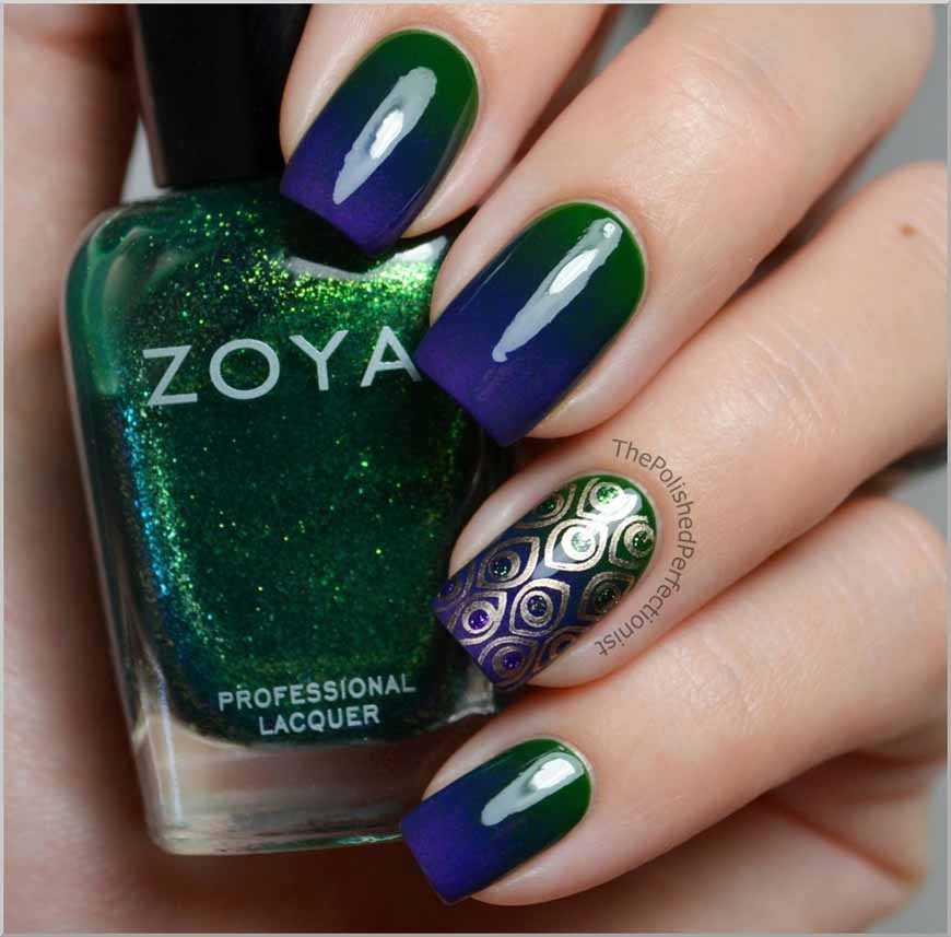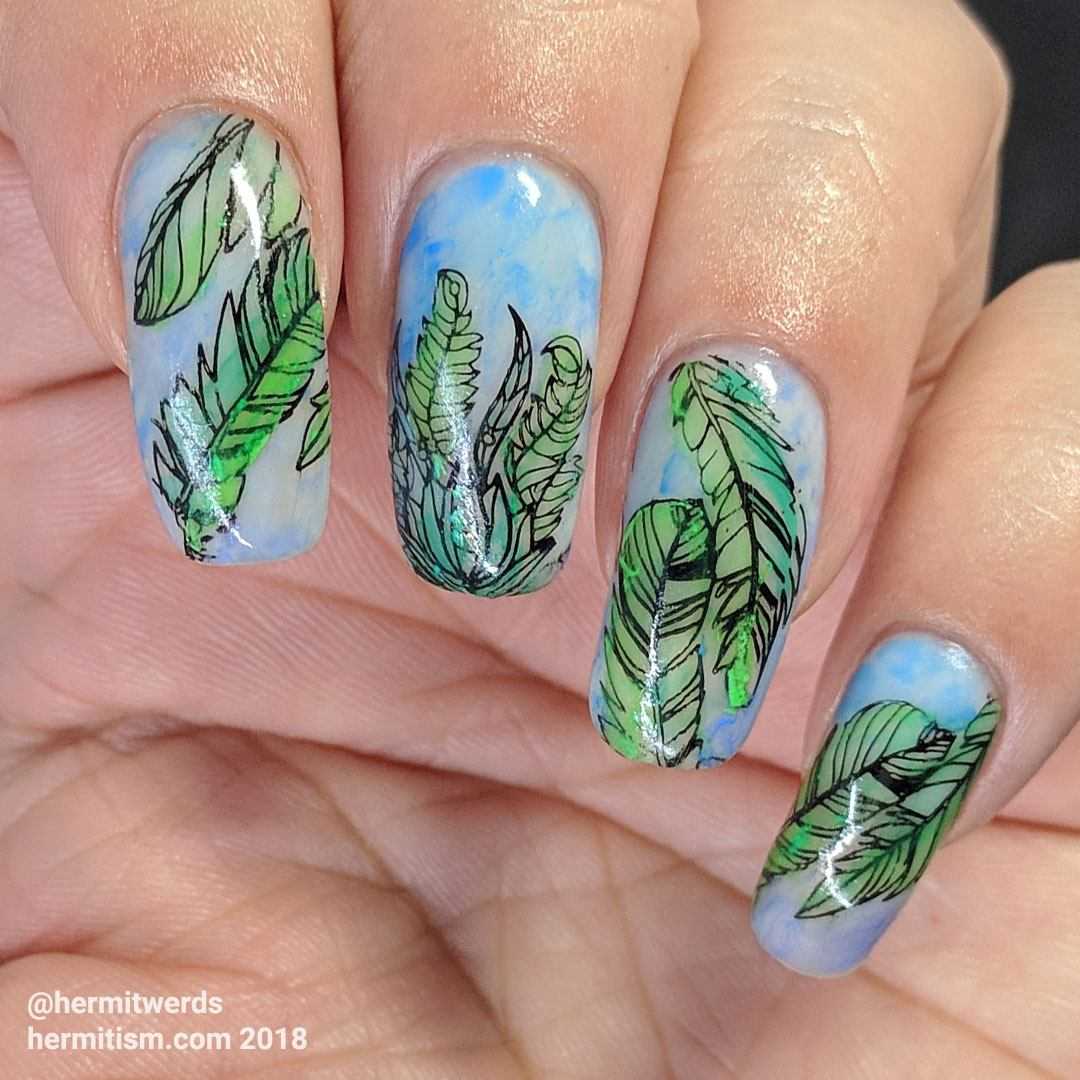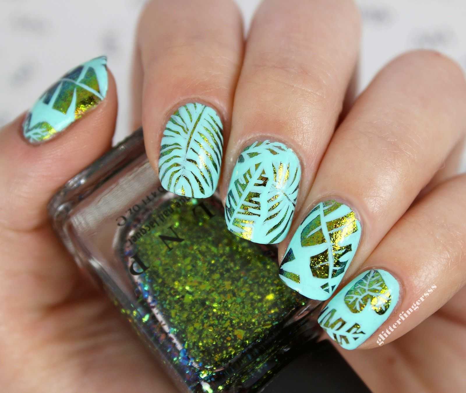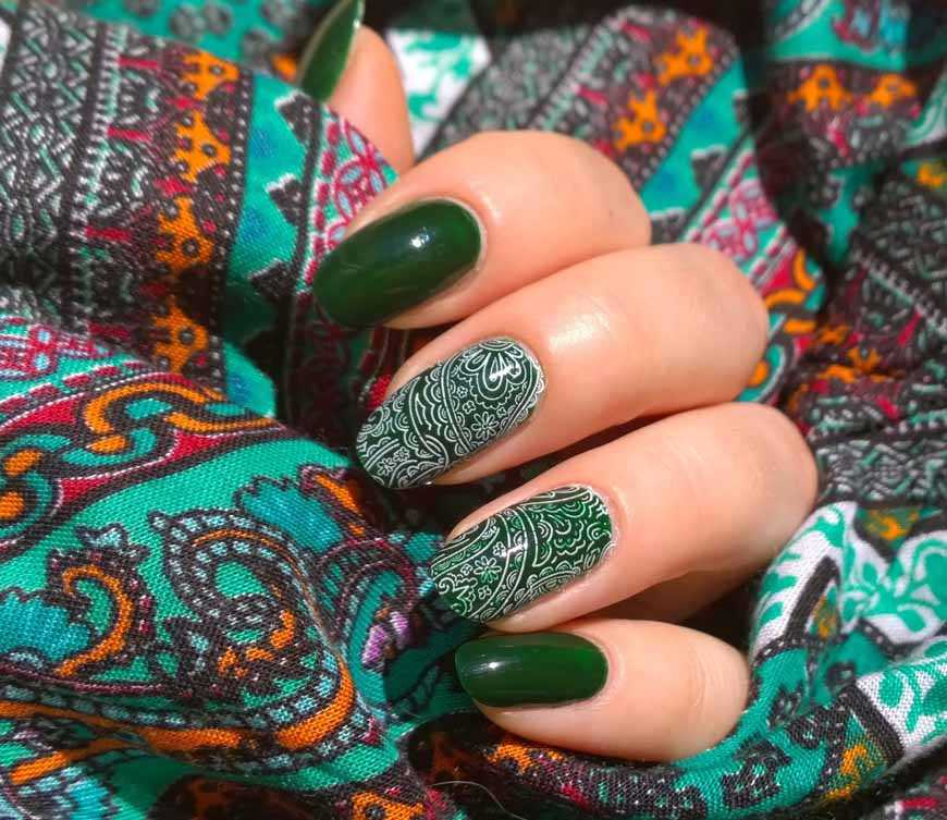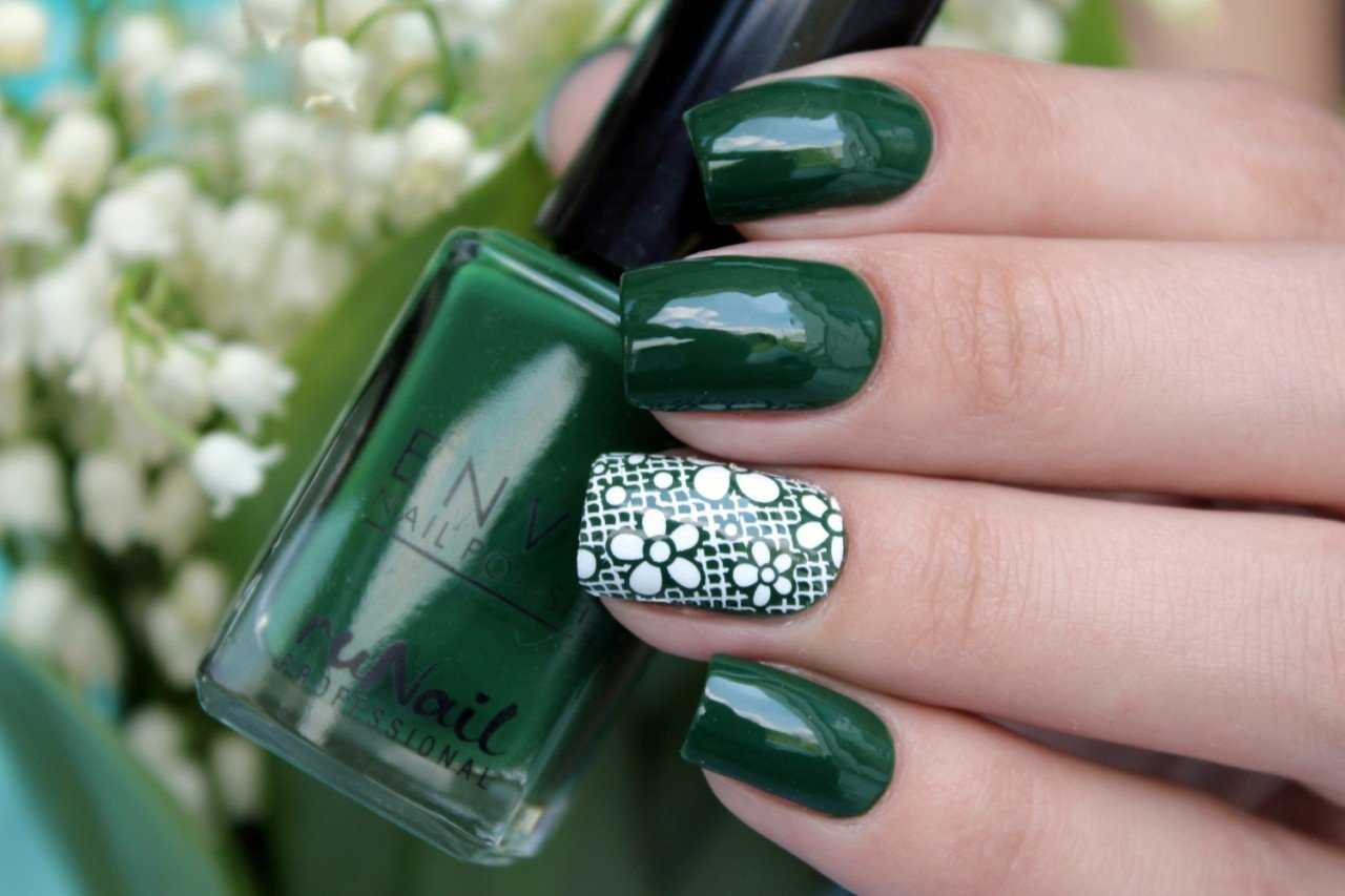 Зеленый дизайн ногтей может быть выполнен с различными узорами с помощью трафаретов (стемпинг). Для этого все ногти также покрываются базой, поверх в два слоя наносится лак зеленого цвета