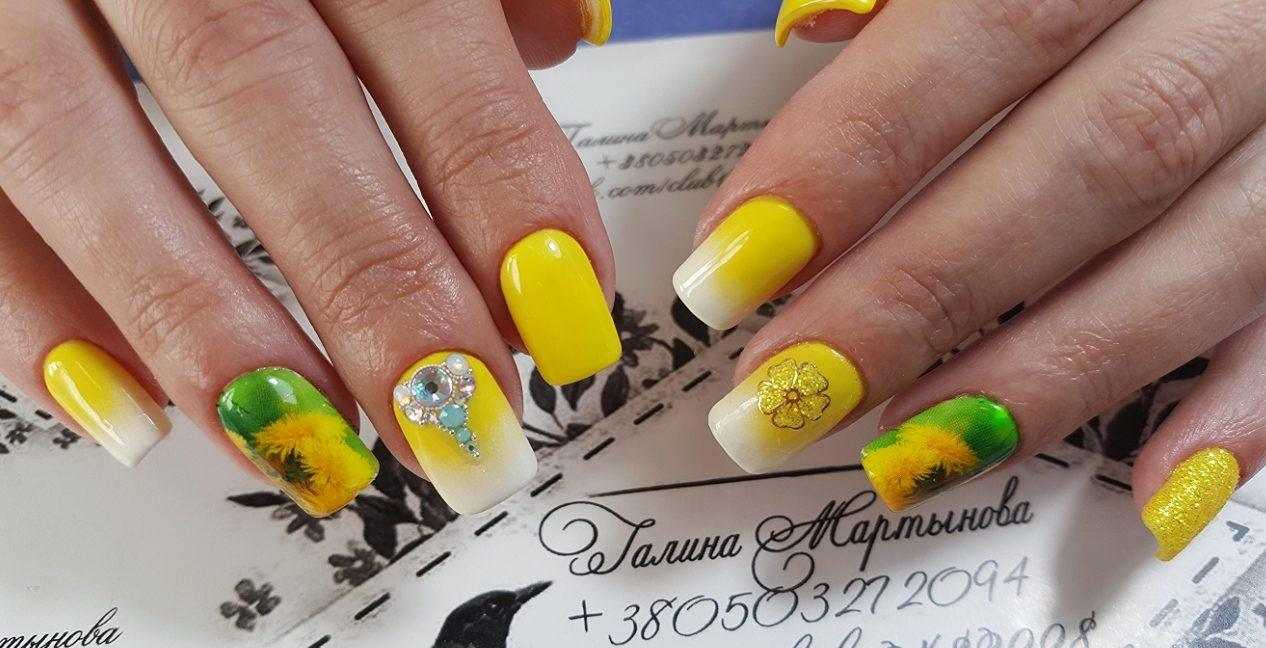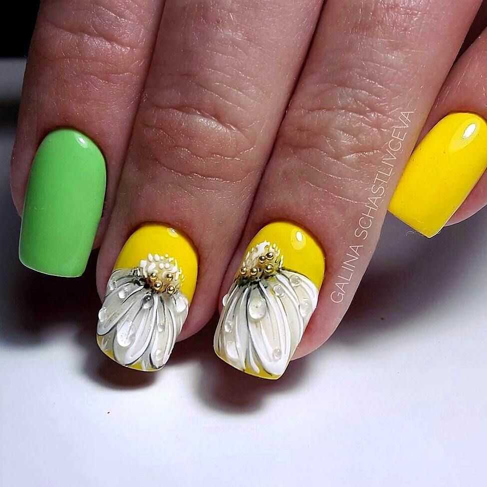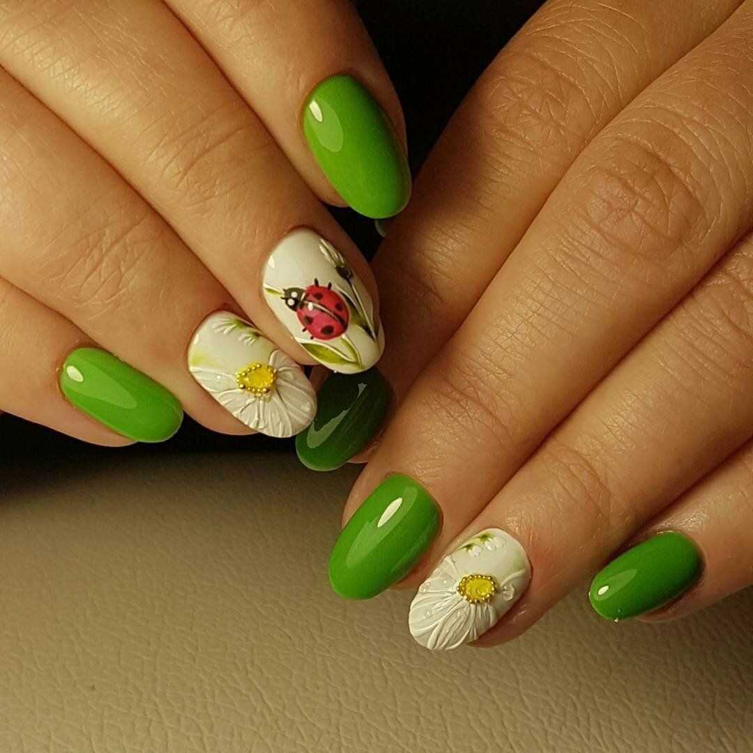 Представьте, что однотонное зеленое покрытие на ногтях – это летний луг, на котором в изобилии цветут полевые цветы, ромашки, незабудки, клевер. Дизайн с полевыми цветами станет лучшим дополнением вашего летнего образа. Маникюр смотрится непередаваемо красиво, ярко и вдохновляюще.