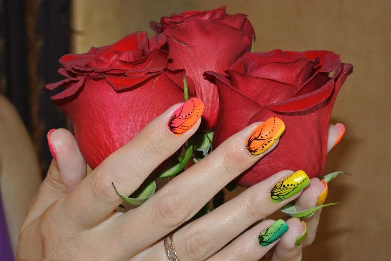 Что касается флористики, то на градиентном фоне желательно располагать незначительный декор. Ограничьтесь миниатюрными веточками и листьями на нескольких пальцах руки, выделите прикорневую зону стразами и икринками. Помните, градиентный фон визуально смотрится тяжело и насыщенно, поэтому декор должен компенсировать большое количество оттенков.