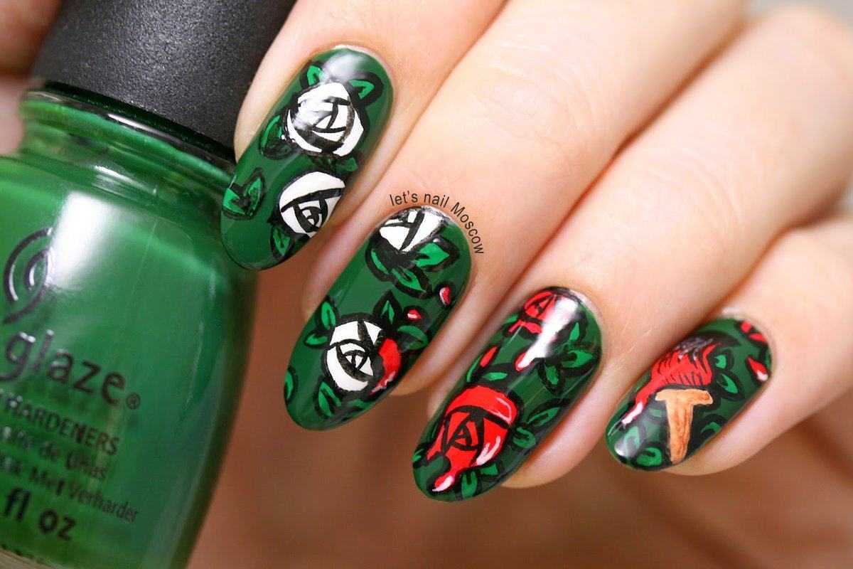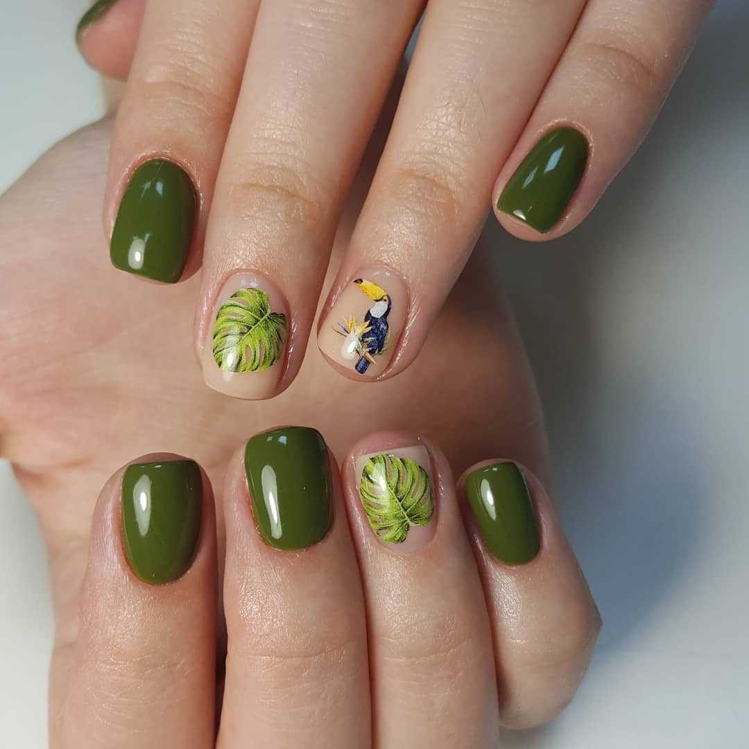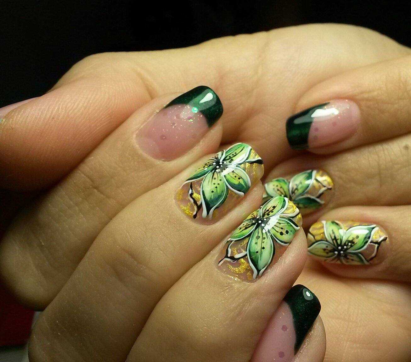 Чтоб выполнить яркий и гармоничный маникюр, мало окрасить его зеленным цветом, необходимо использовать дополнительный декор. Самым лучшим вариантом станут соответствующие цветочные узоры. Яркие и удивительные цветы получатся в технике витраж. Выполнять витражные рисунки лучше всего на темно-зеленом фоне