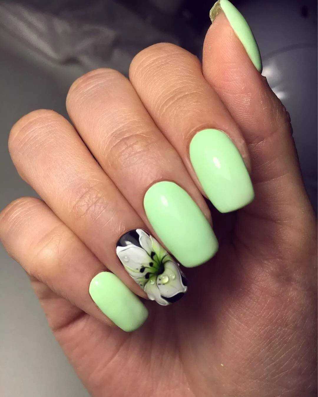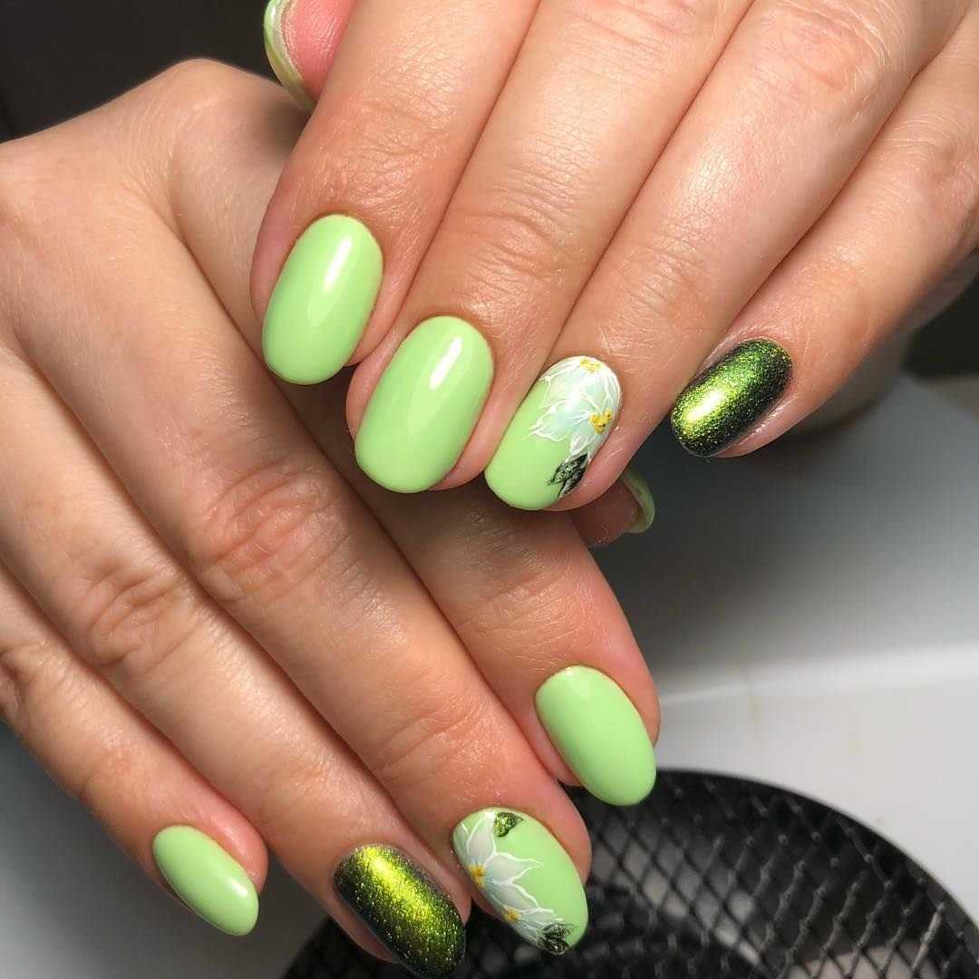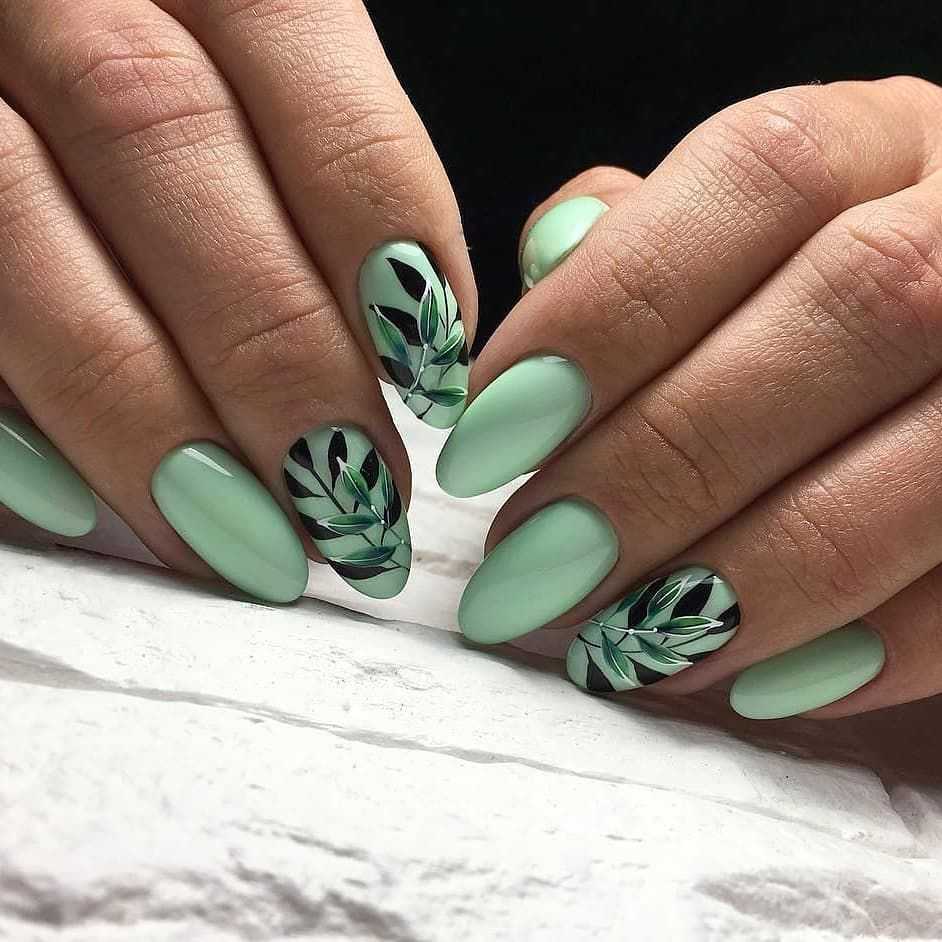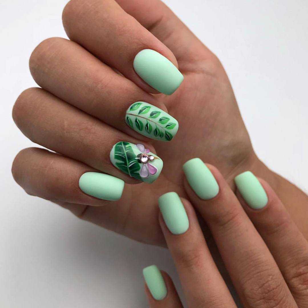 Бархатный зеленый маникюр особенно популярен в весенних и летних образах. Дизайн источает утреннюю свежесть, безмятежность и уют. Используйте для матового покрытия яркие светлые оттенки зеленого. Особенно красиво выглядит однотонный мятный дизайн с темной флористикой на безымянном пальце.