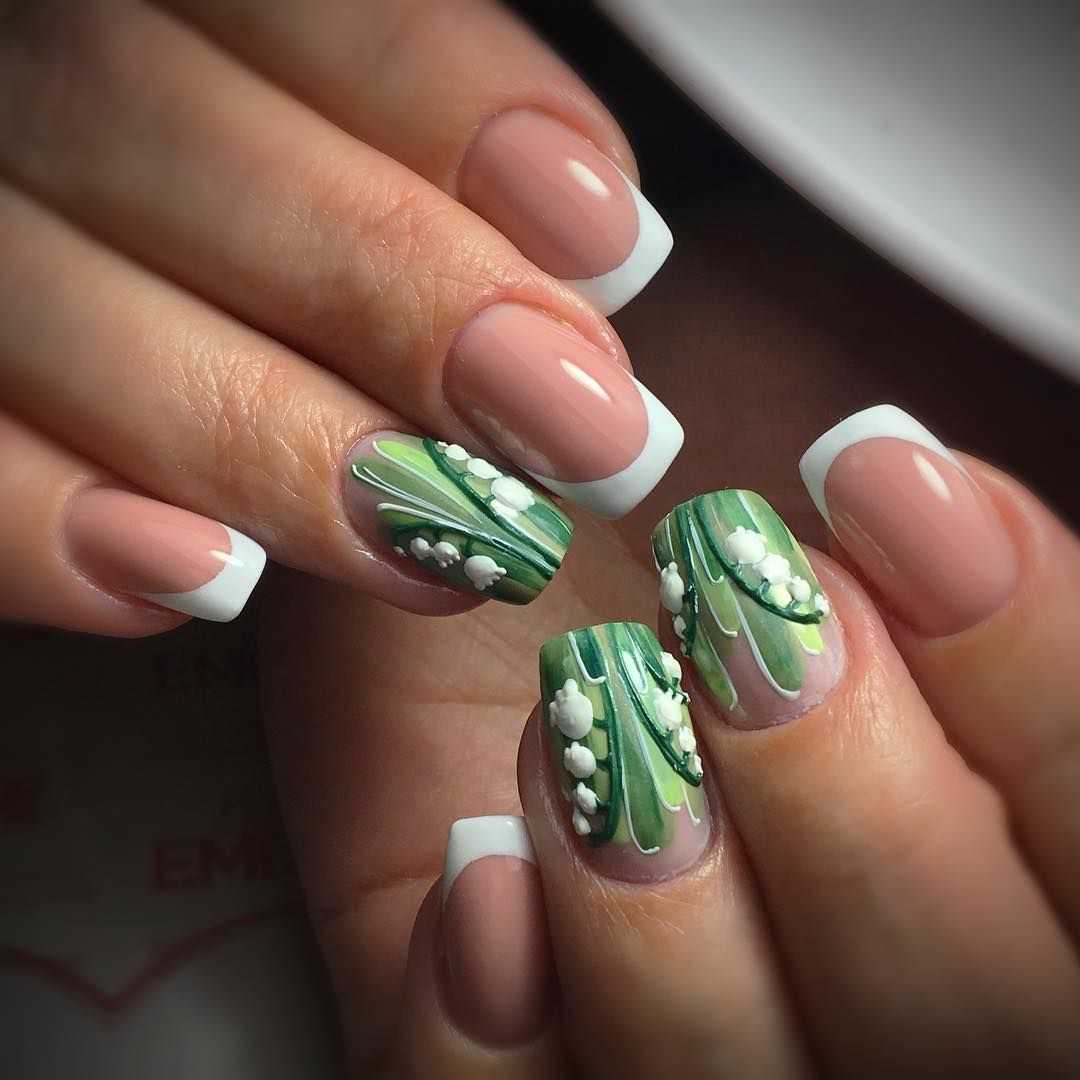 Еще один изысканный вариант – классический французский маникюр в зеленых тонах, который позволит выгодно подчеркнуть края ногтя нежными оттенками зеленого – мятным, салатовым или бирюзой.