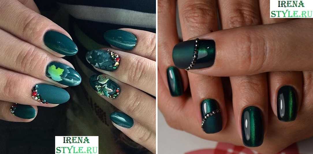 Варианты темно-зеленого и сине-зеленого новогоднего маникюра-2023