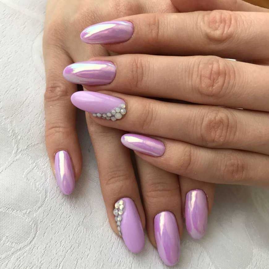 Инкрустация сама по себе, независимо от длины и формы ноготков, довольно яркий и шикарный вид декора. В этой же форме он просто бесподобен. Красивый маникюр на миндальных ногтях со стразами —подчеркивает грациозность и утонченность рук, придавая своими переливами, дорогой и стильный вид.
