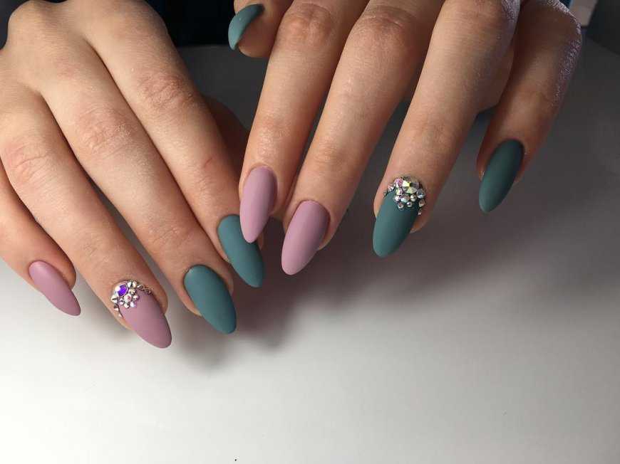 Наиболее простой способ придать миндальным ногтям современный вид — использовать матовый топ в маникюре. Покрытие может быть как сплошным, так и комбинированным. Именно дизайн с использованием различных фактур (глянцевой, матовой, зеркальной) — сейчас наиболее популярный. Сохраняется монохромность