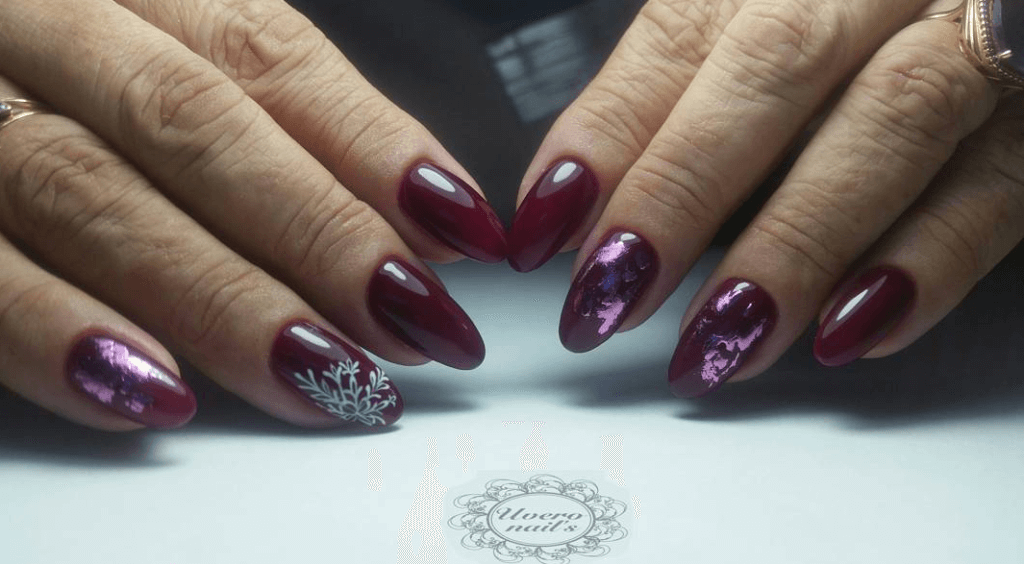 Универсальный дизайн с фольгой является одним из самых простых и стильных вариантов на миндальных ногтях. За счет того, что оттиски каждый раз получаются различными — маникюр будет всегда уникальным. Золотую, серебристую, опаловую или разноцветную фольгу можно покрыть матовым топом, получая при этом глубокую очень натуралистическую «металлическую» текстуру.