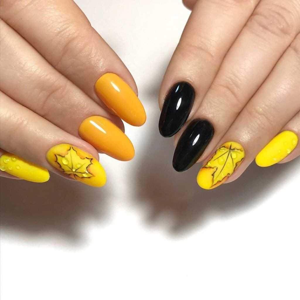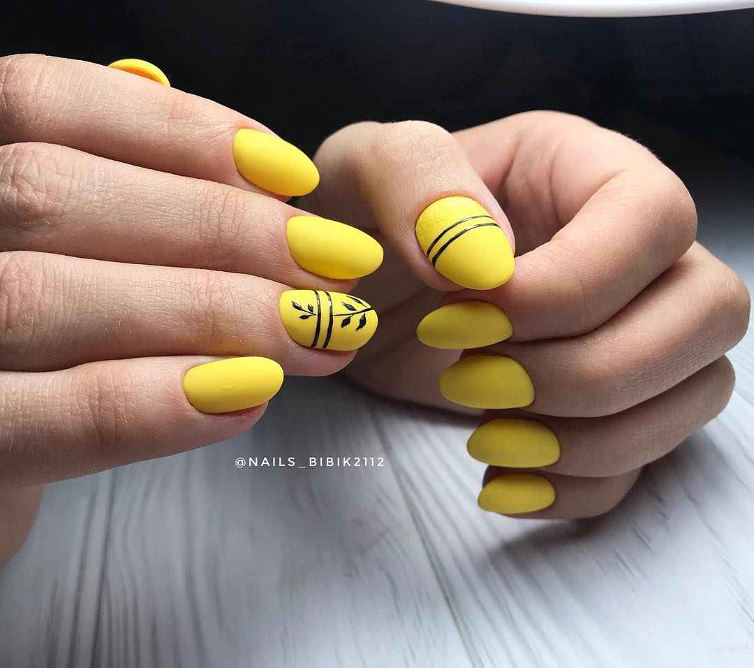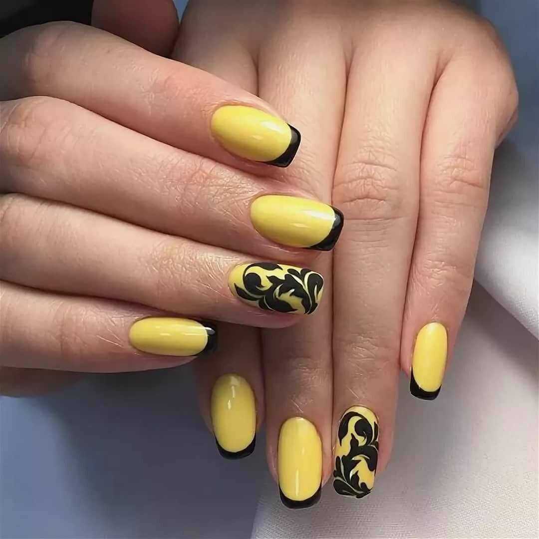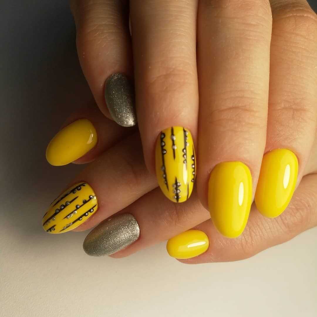 Если вы не хотите экспериментировать с образом, выбирайте маникюр желтый с черным. Угольный тон будет преобразовывать дизайн в интеллигентный и харизматичный вид. Теперь вы не будете выглядеть легкомысленно и наивно, т. к. присутствует сдержанный тон.