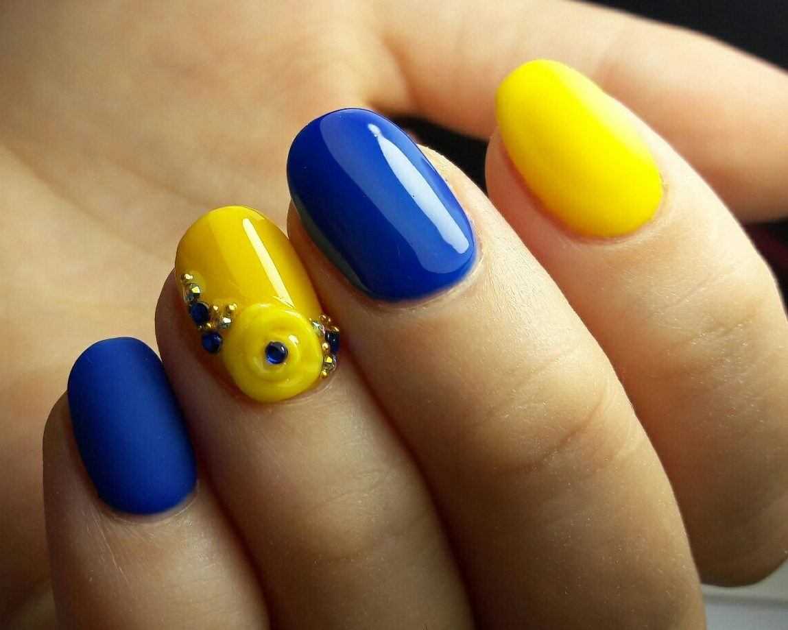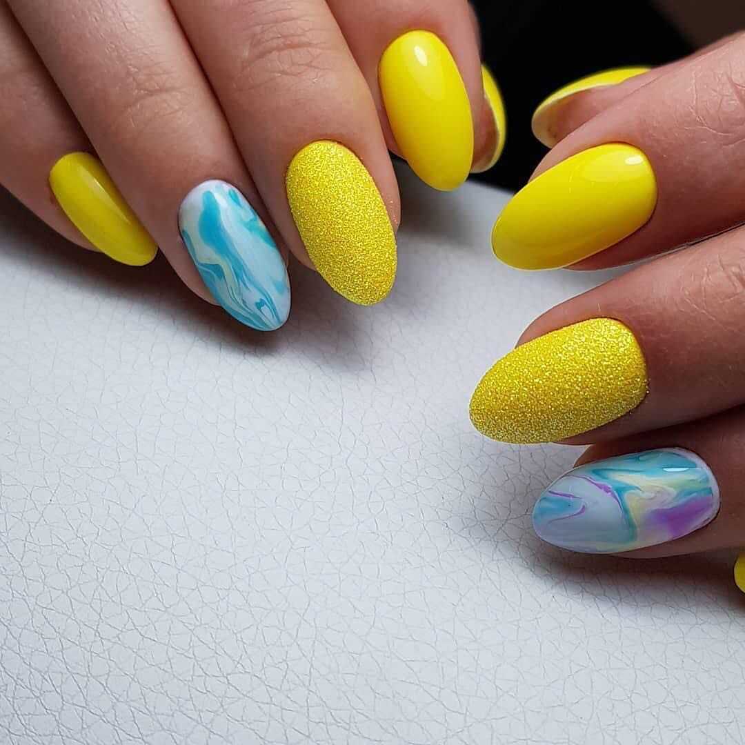 Красиво сочетается желтый лак с голубым, и даже с синим. С помощью такой комбинации вы сможете создать на ногтях морской дизайн.