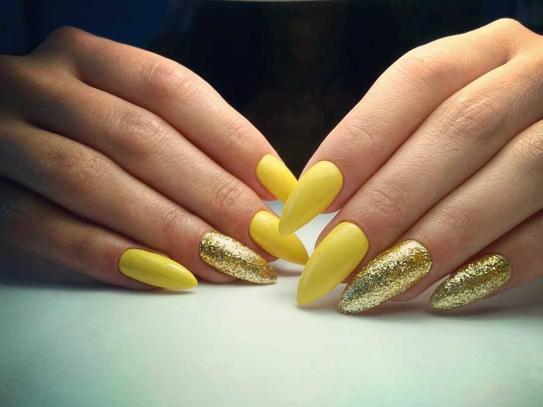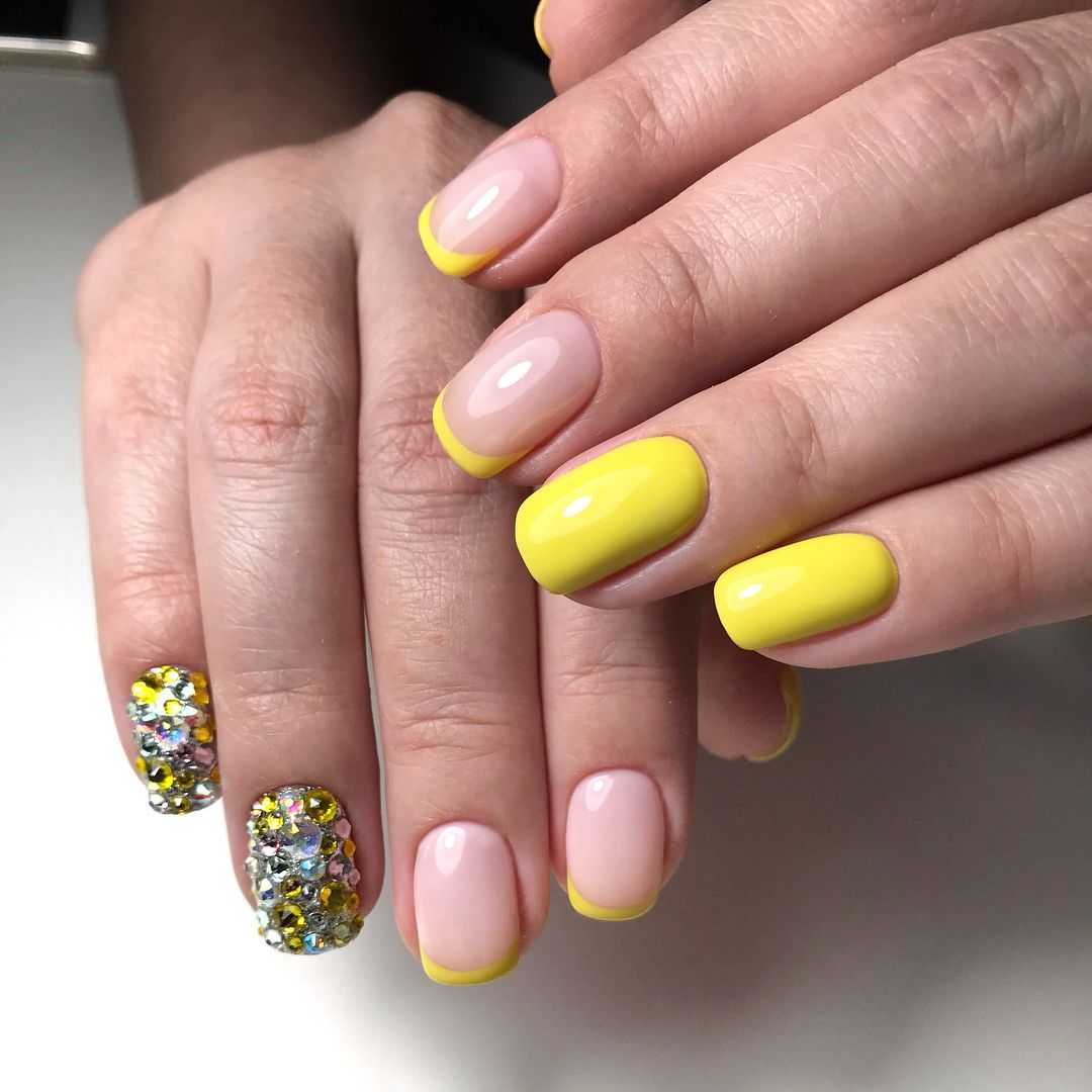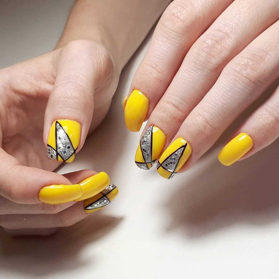Желтый — один из цветов маникюра, который одинаково хорошо сочетается как с золотом, так и с серебром. Выбирая стразы или блестки, необходимо ориентироваться на оттенок покрытия ногтей. С яркими или горчичными тонами шикарно смотрится золото. Чем бледнее или холоднее оттенок, тем органичнее выглядит комбинация с серебром.