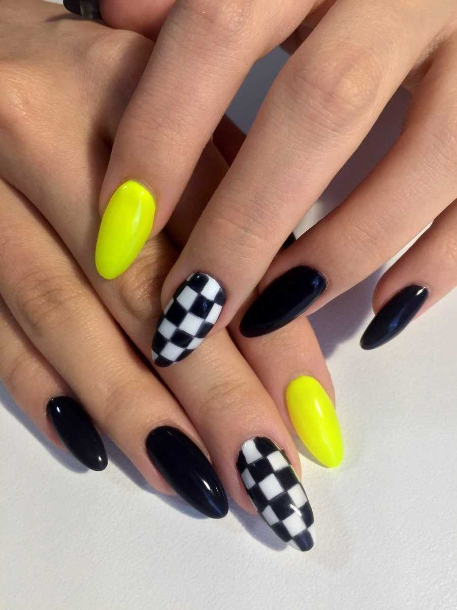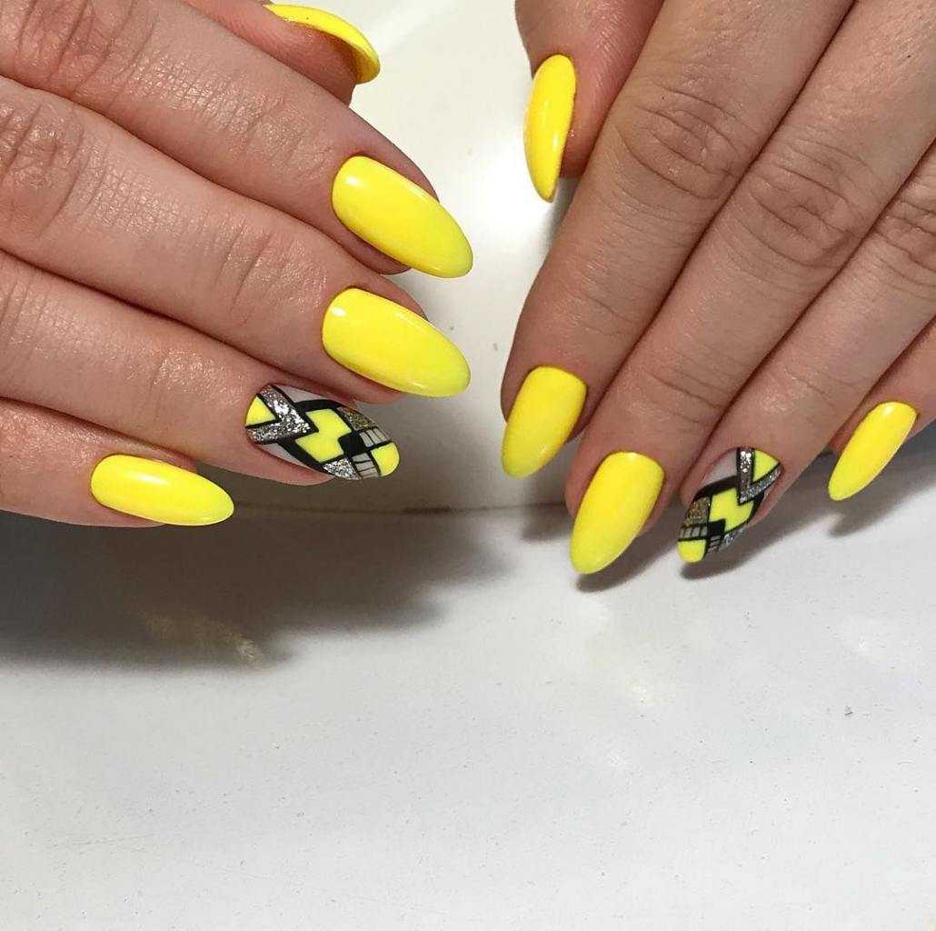 Одно из самых классических сочетаний — микс черного и желтого. В этом случае можно не стесняясь выбирать самые яркие тона этого солнечного цвета — базовый черный или серебряный их приглушит. Маникюр в черно-желтом цвете в 2023 будет смотреться ярко, дерзко и стильно.