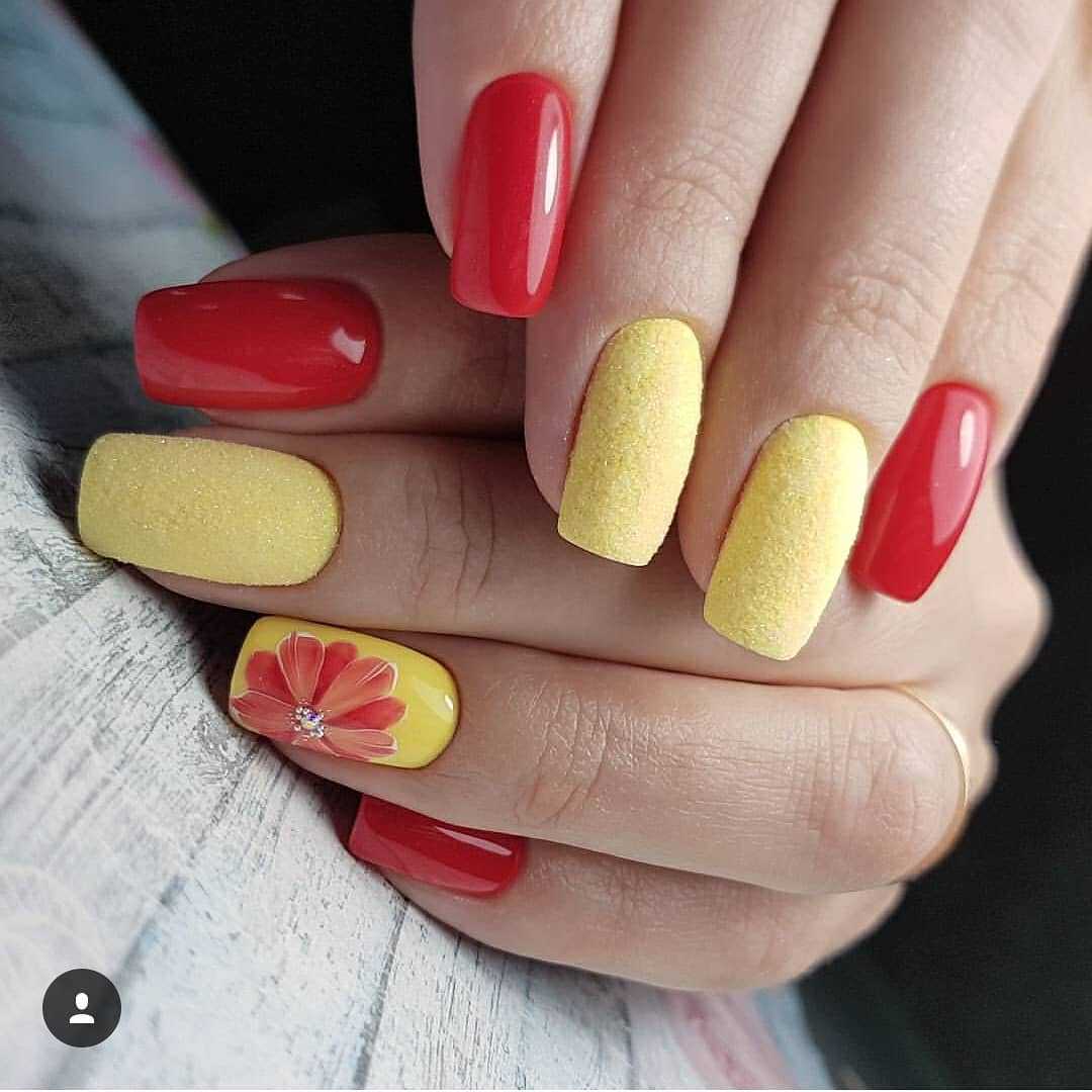 Первые сомнительные претенденты — красный и оранжевый. Несмотря на то, что они вызывают такие же яркие и теплые ассоциации, как и желтый, с таким миксом легко переборщить и в итоге маникюр будет выглядеть слишком ярко, что повлияет на весь твой образ. Если ты хочешь использовать эти цвета на одном ногте, убедись, что их соотношение не равное. Например, если 80% площади ногтей будет желтого цвета, а на остальных 20% будут вкрапления красного и оранжа — будет отлично. То же правило работает и наоборот.