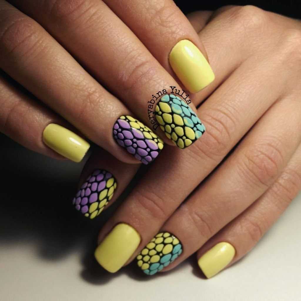 Также в качестве пары к нежно-желтому маникюру всегда можно подобрать пастельные оттенки: фиолетовый, голубой, салатовый и другие. Здесь работает логика схожей контрастности. Таким образом можно сделать летний желтый маникюр, который будет ярким и модным, но при этом не слишком заметным и бросающимся в глаза.