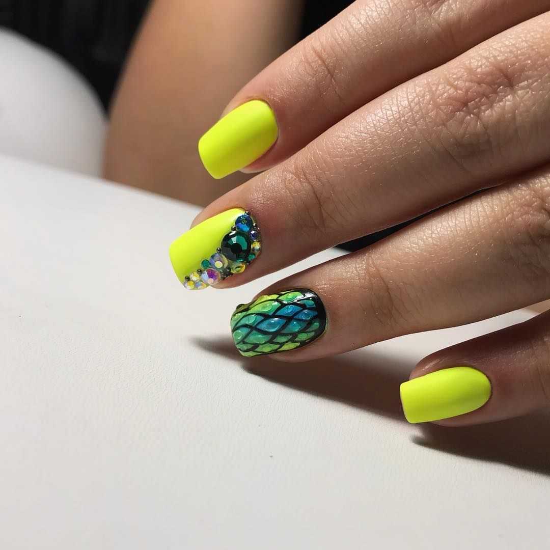 Пигменты позволяют создать на ногтях эффекты: зеркала, хрома, металлического мерцания. С лимонным, горчичным и неоновым одинаково эффектно смотрятся как полное покрытие пигментом, то есть нанесение его на поверхность всех ногтей, так и комбинированный вариант. На 1-2 ногтях на каждой руке мастер делает рисунки или другой декор, а остальные ногти покрываются пигментом.