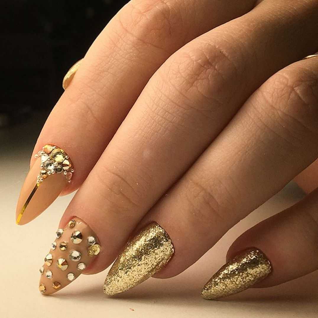 Стразы на длинных ногтях крайне популярны, поэтому еще один вариант оформления – заполнение ногтя на безымянном пальце блестящими камушками.