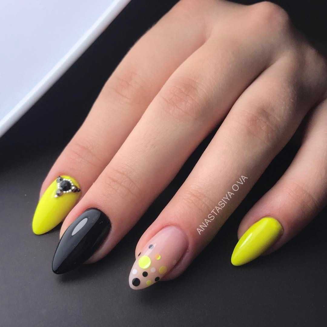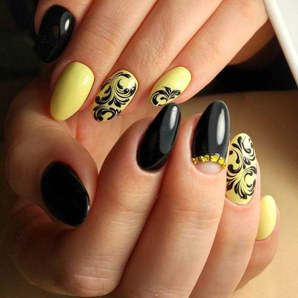 С черным и желтым цветом можно выполнить шикарный французский маникюр, дизайн с росписью этническими узорами, с геометрией, с минималистичным декором. Используйте глянцевые гель-лаки, так маникюр получится оригинальнее и ярче. Один из вариантов красивого и интересного маникюра – это однотонное желтое окрашивание ногтей с последующим декорированием черными стразами. Такой маникюр выглядит благородно и дорого, разительно отличается от желтого дизайна с ромашками и подсолнухами. Черно-желтый маникюр можно использовать в повседневных летних образах или сделать его частью торжественного лука, при условии, что он сочетается с платьем или аксессуарами.