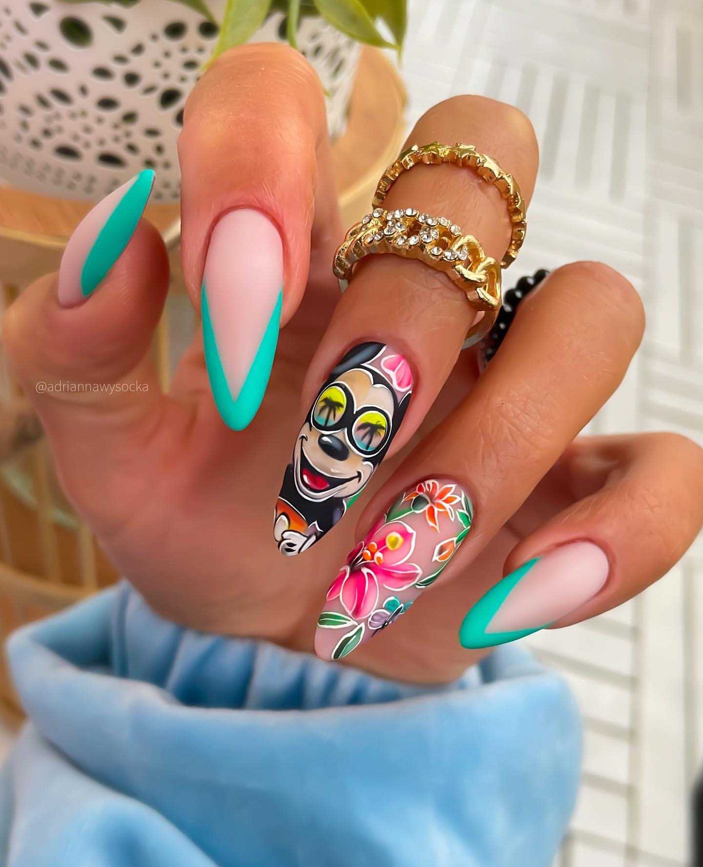 Спешим вам с полной уверенностью сообщить о том, что мятный цвет считается достаточно универсальным и легко комбинируемым с другими контрастными оттенками в маникюре. Для любительниц ярких ноготочков nail мастера предлагают в 2022 году попробовать сделать маникюр с комбинацией розового и мятного цвета. Мы вас уверяем, что это сочетание станет вашим фаворитом на долгие годы. Имея у себя под рукой мятный и розовый лак, можно сделать огромное количество разнообразных дизайнов маникюра, среди которых: