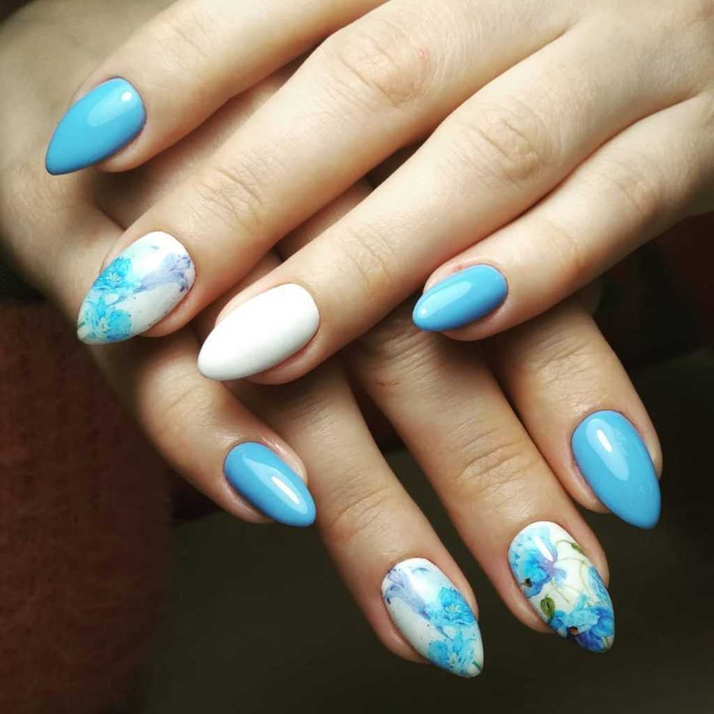 Среди актуальных трендов нейл-арта 2020 года стоит выделить цветочный рисунок. Чтобы сделать его более заметным, в качестве фона лучше использовать нейтральные оттенки. К примеру, бежевый, молочный, светло-розовый цвет. Что касается непосредственно рисунка, его можно выполнить в синем цвете. Небольшие веточки с листьями или бутонами – лаконичное оформление на каждый день. Крупные цветы разных размеров больше подходя для вечернего элегантного образа. При желании его можно украсить стразами или блестками.